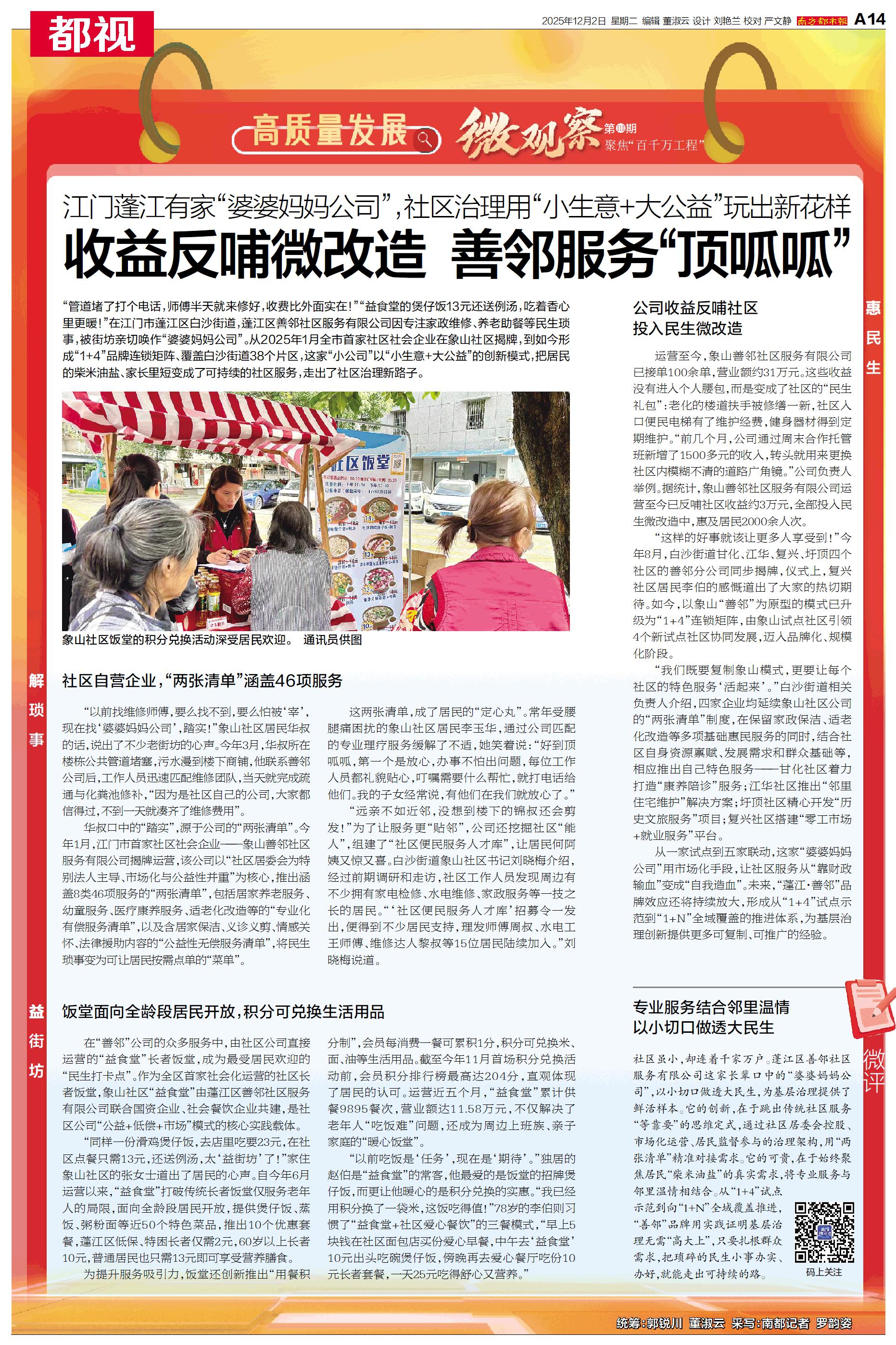 在江门市蓬江区白沙街道,蓬江区善邻社区服务有限公司因专注家政维修、养老助餐等民生琐事,被街坊亲切唤作“婆婆妈妈公司”。