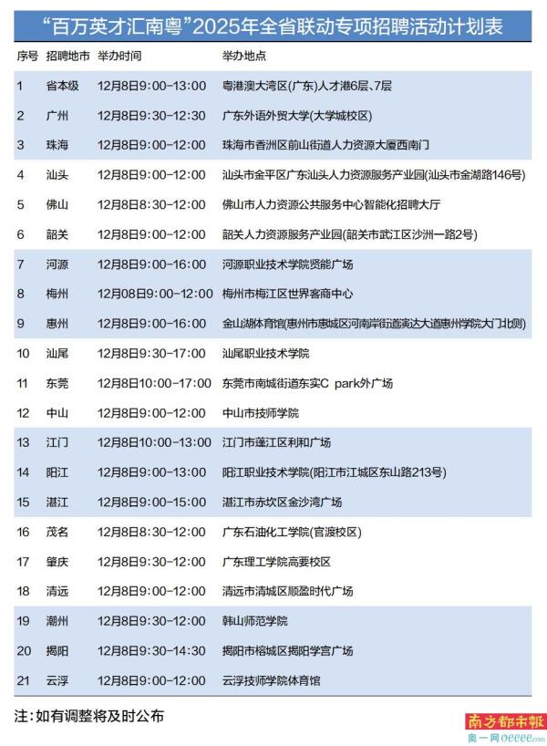 南都讯 根据“百万英才汇南粤”行动计划统一部署,聚焦年底求职关键阶段,广东将于12月8日启动“百万英才汇南粤”2025年全省联动专项招聘活动,省本级和全省20个地市将同步举办专项招聘,以“全省联动、优岗云集”的强劲势能,向全国高校毕业生发出年末“逐梦南粤”的诚意邀约。