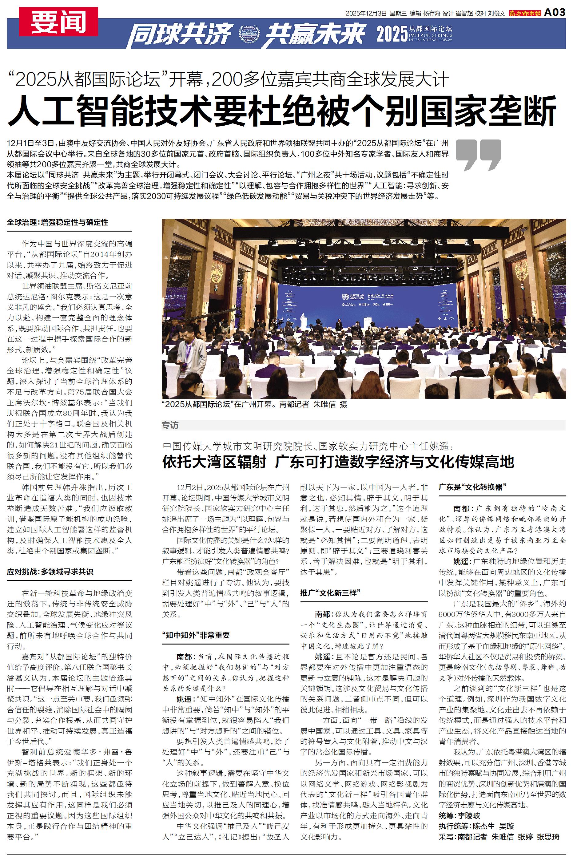 12月1日至3日,由澳中友好交流协会、中国人民对外友好协会、广东省人民政府和世界领袖联盟共同主办的“2025从都国际论坛”在广州从都国际会议中心举行。
