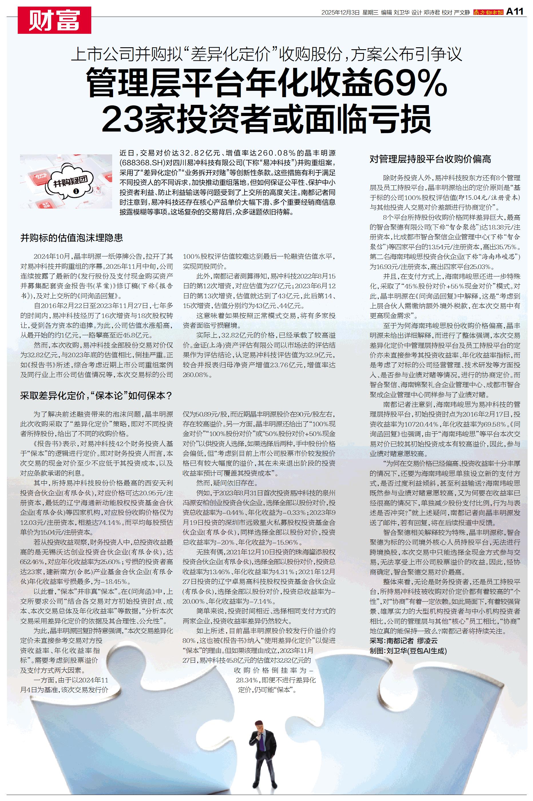 近日,交易对价达32.82亿元、增值率达260.08%的晶丰明源(688368.SH)对四川易冲科技有限公司(下称“易冲科技”)并购重组案,采用了“差异化定价”“业务拆开对赌”等创新性条款。