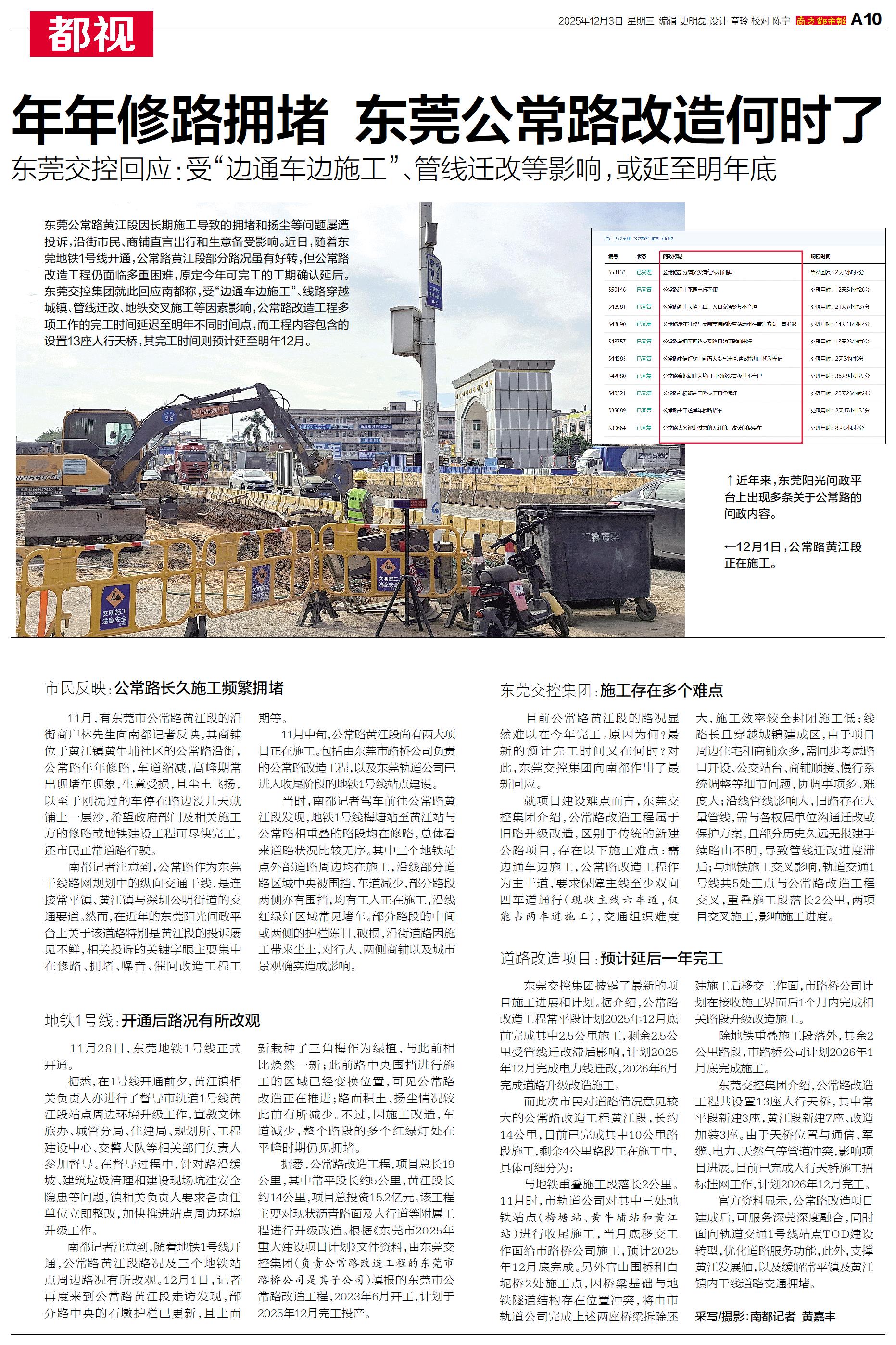 东莞公常路黄江段因长期施工导致的拥堵和扬尘等问题屡遭投诉,沿街市民、商铺直言出行和生意备受影响。