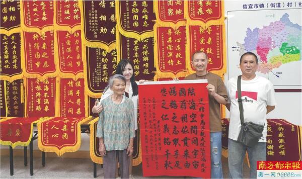 信宜市侨商会执行秘书长陈麒丞(右二)已助力众多家庭团圆,收到超百面锦旗。