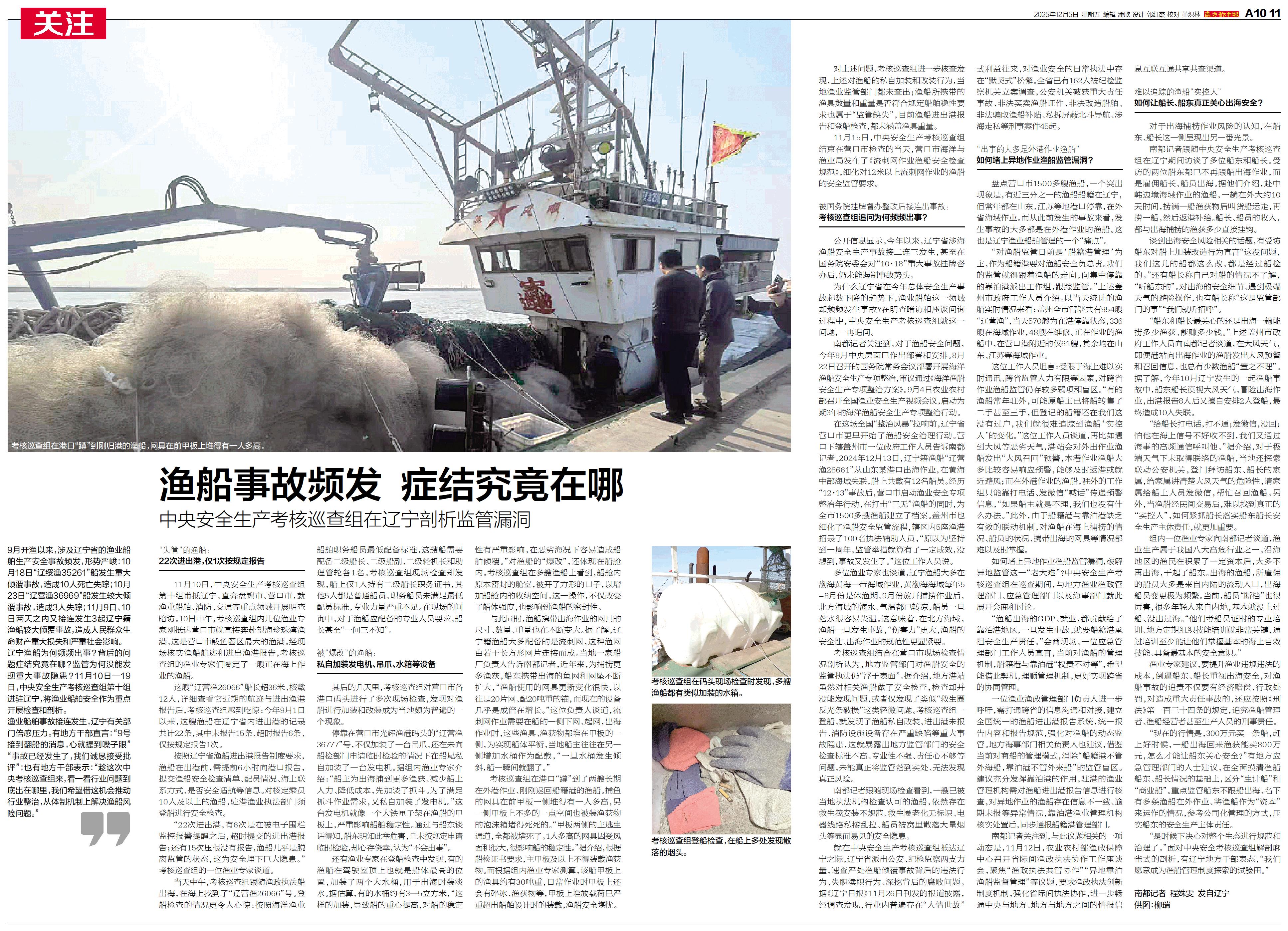 11月10日—19日,中央安全生产考核巡查组第十组进驻辽宁,将渔业船舶安全作为重点开展检查和剖析。