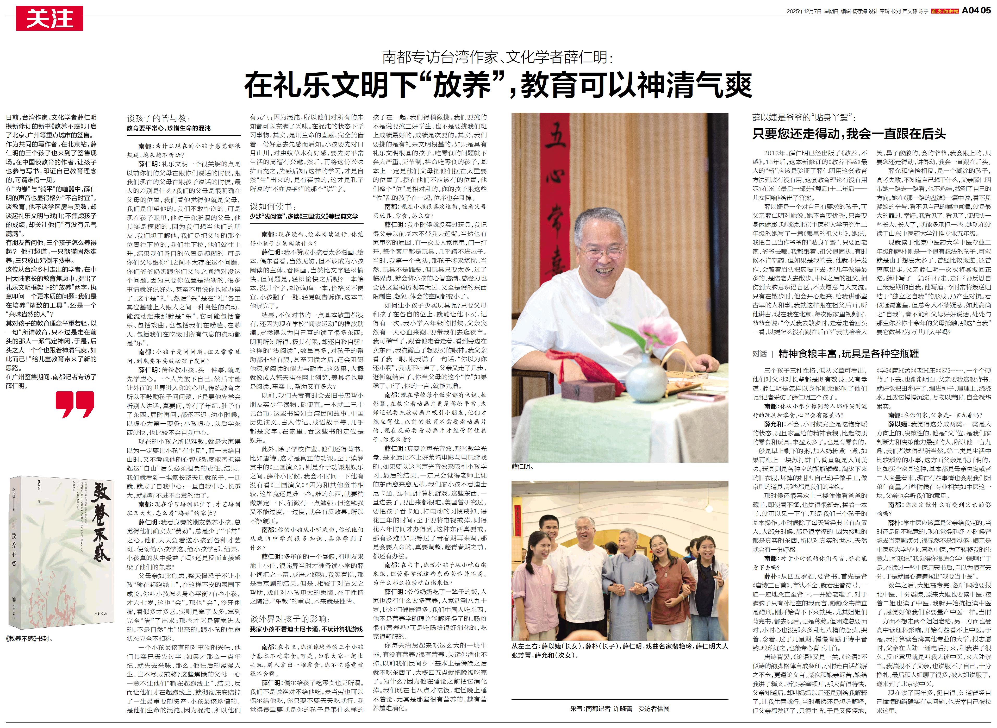 日前,台湾作家、文化学者薛仁明携新修订的新书《教养不惑》开启了北京、广州等重点城市的签售。