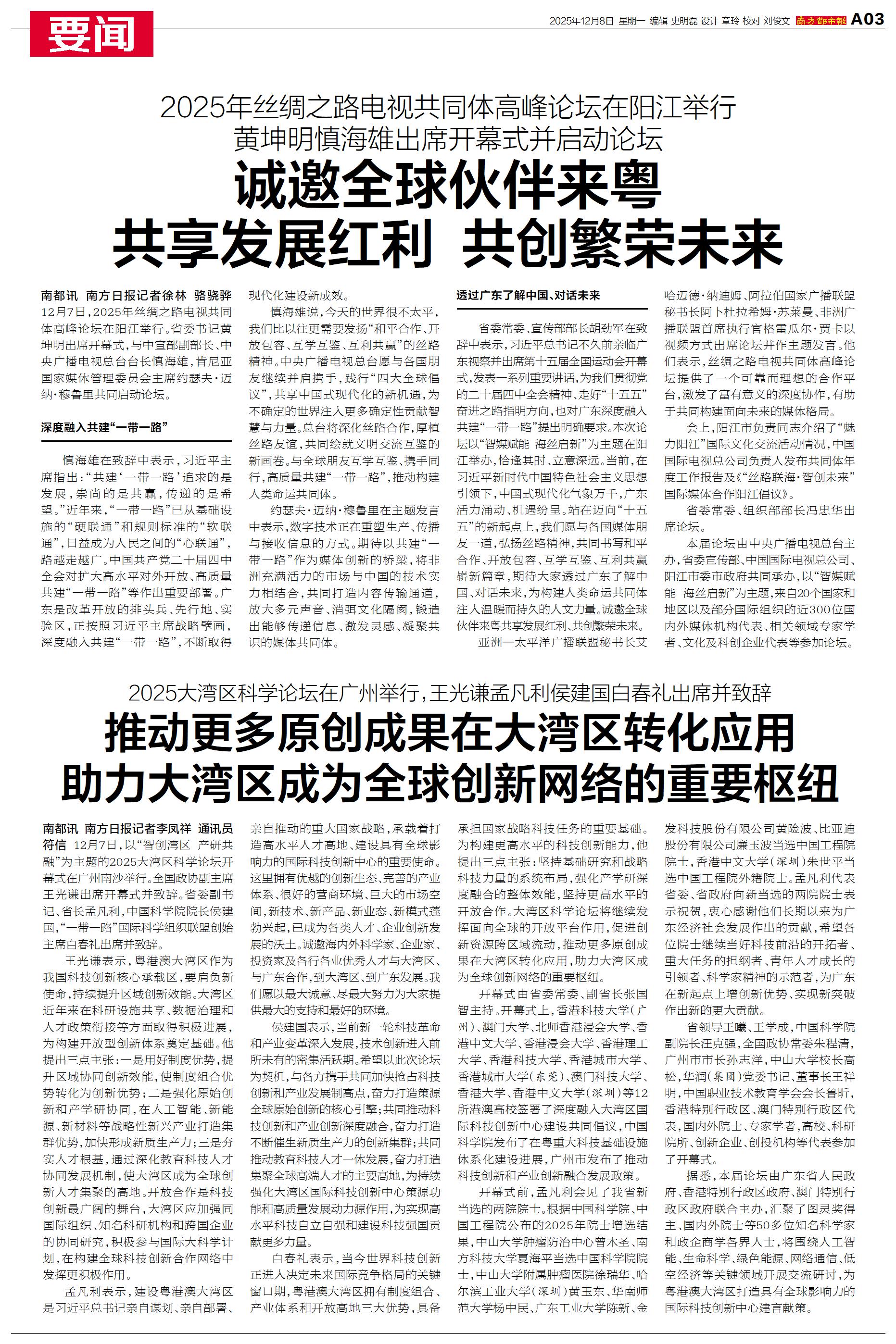 南都讯 南方日报记者李凤祥 通讯员符信 12月7日,以“智创湾区 产研共融”为主题的2025大湾区科学论坛开幕式在广州南沙举行。全国政协副主席王光谦出席开幕式并致辞。省委副书记、省长孟凡利,中国科学院院长侯建国,“一带一路”国际科学组织联盟创始主席白春礼出席并致辞。