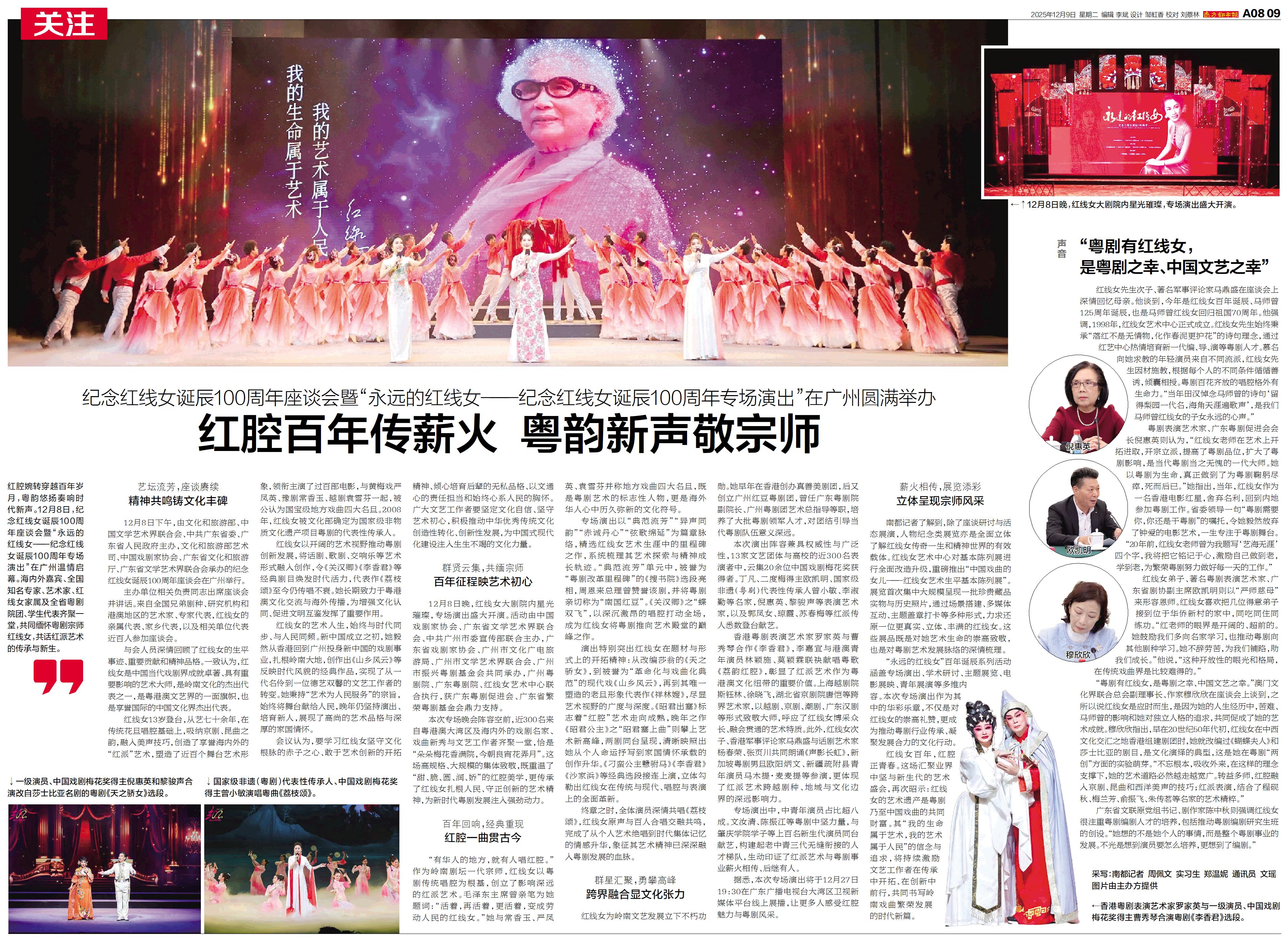 12月8日,纪念红线女诞辰100周年座谈会暨“永远的红线女——纪念红线女诞辰100周年专场演出”在广州温情启幕。