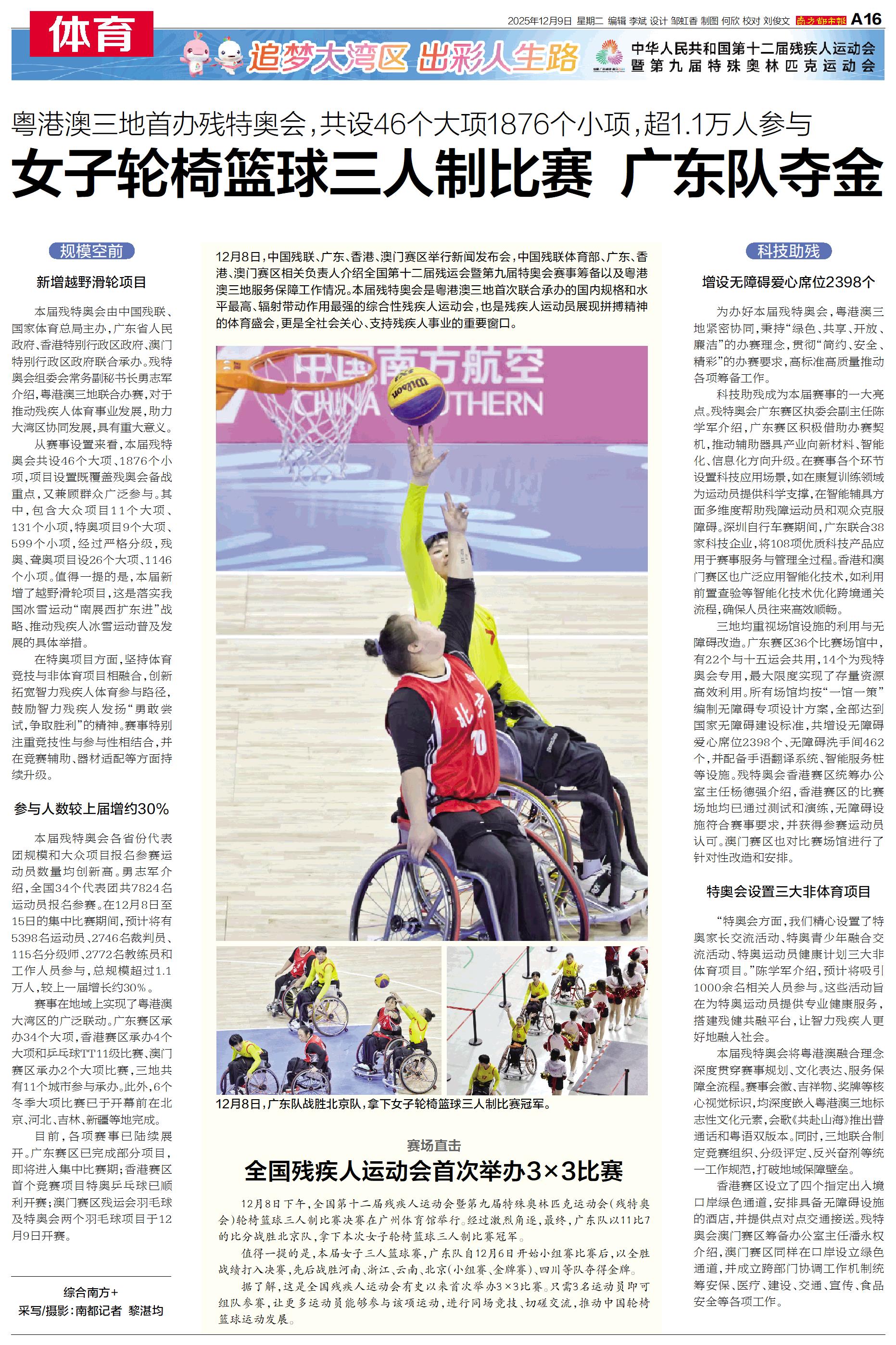 12月8日,中国残联、广东、香港、澳门赛区举行新闻发布会,中国残联体育部、广东、香港、澳门赛区相关负责人介绍全国第十二届残运会暨第九届特奥会赛事筹备以及粤港澳三地服务保障工作情况。