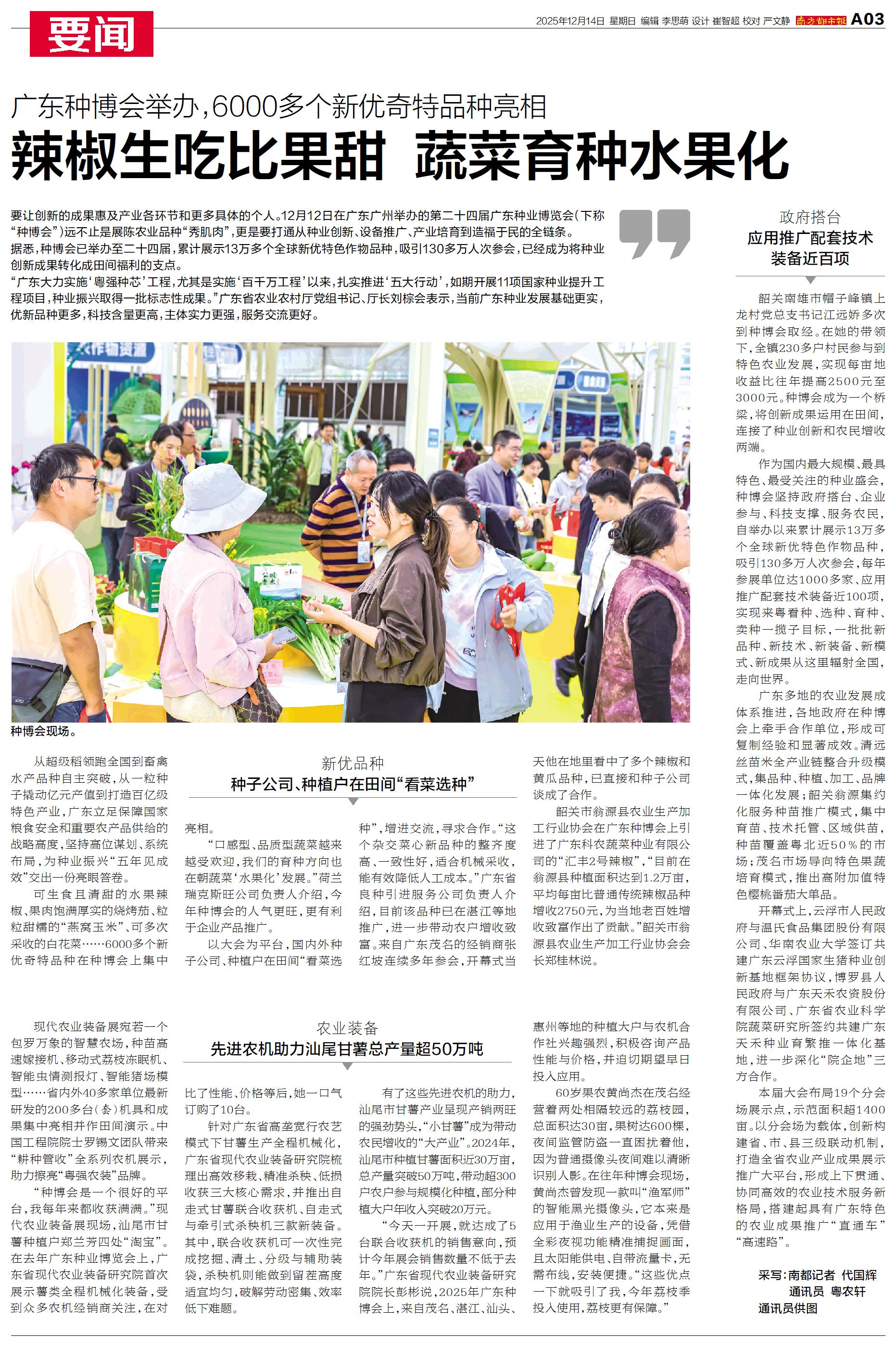 要让创新的成果惠及产业各环节和更多具体的个人。12月12日在广东广州举办的第二十四届广东种业博览会(下称“种博会”)远不止是展陈农业品种“秀肌肉”,更是要打通从种业创新、设备推广、产业培育到造福于民的全链条。