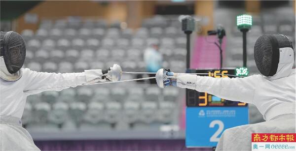 广东击剑选手罗兴东(右)和钟英杰在金牌赛中。