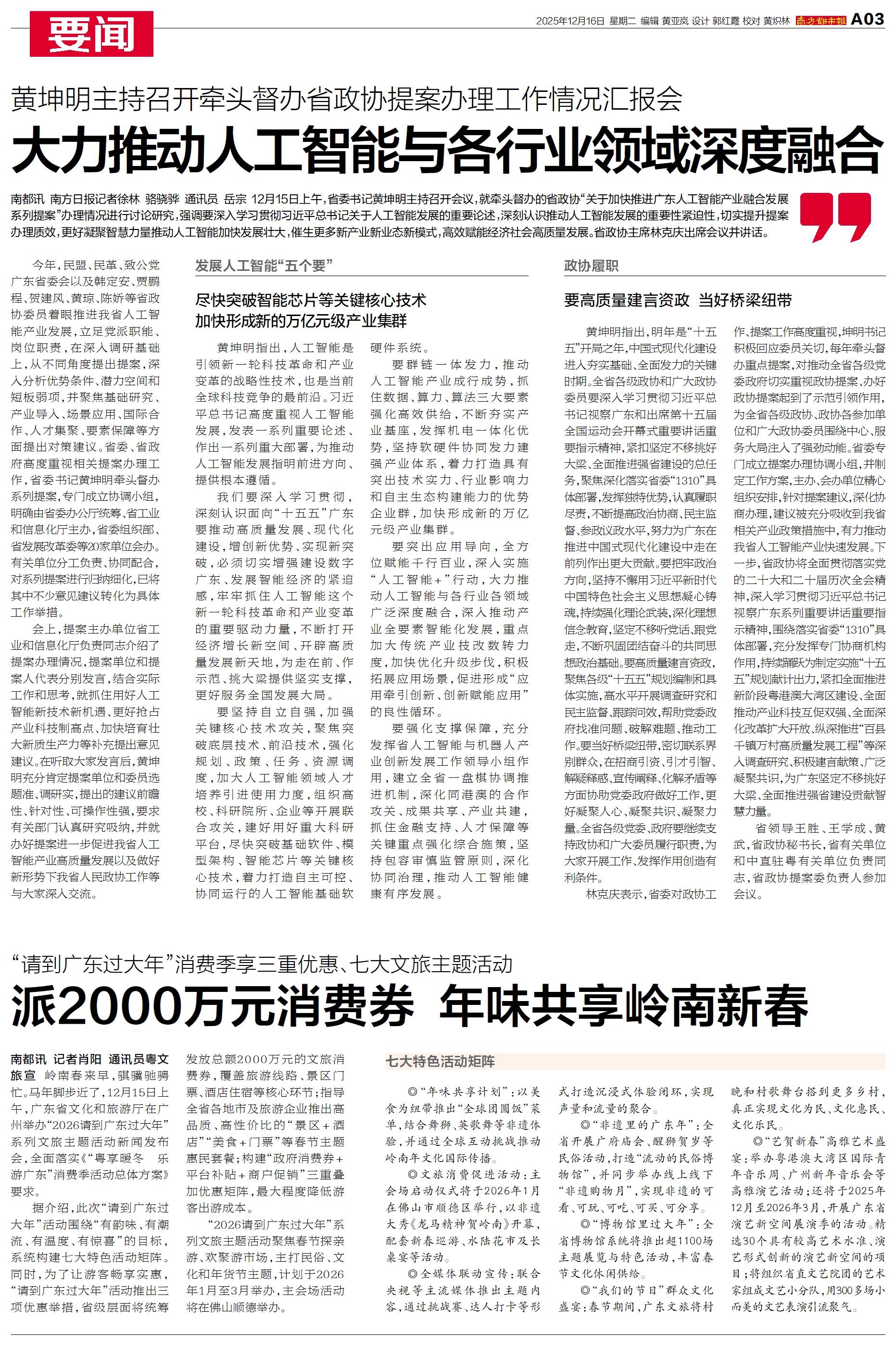 12月15日上午,省委书记黄坤明主持召开会议,就牵头督办的省政协“关于加快推进广东人工智能产业融合发展系列提案”办理情况进行讨论研究。