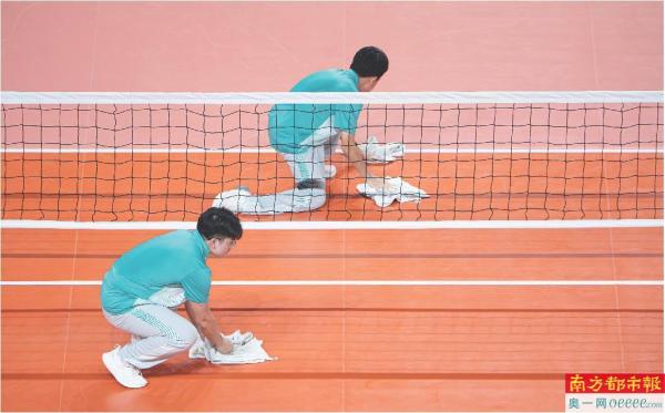 “小海豚”及时清擦地板,为赛事做好保障。