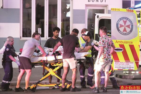 12月14日,在澳大利亚悉尼邦迪滩,医务人员将枪击案受害者送往救护车。 新华社发