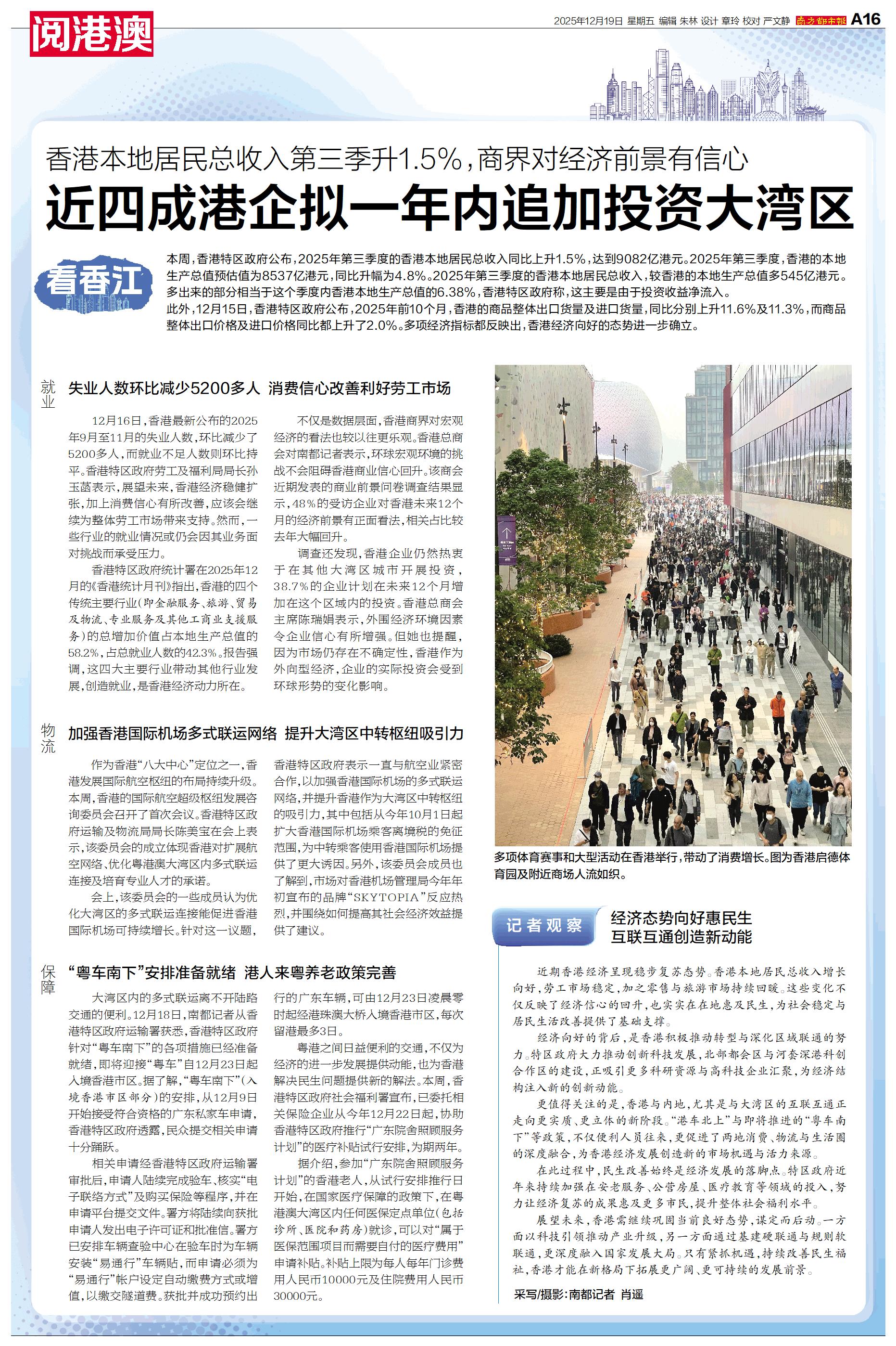 本周,香港特区政府公布,2025年第三季度的香港本地居民总收入同比上升1.5%,达到9082亿港元。2025年第三季度,香港的本地生产总值预估值为8537亿港元,同比升幅为4.8%。