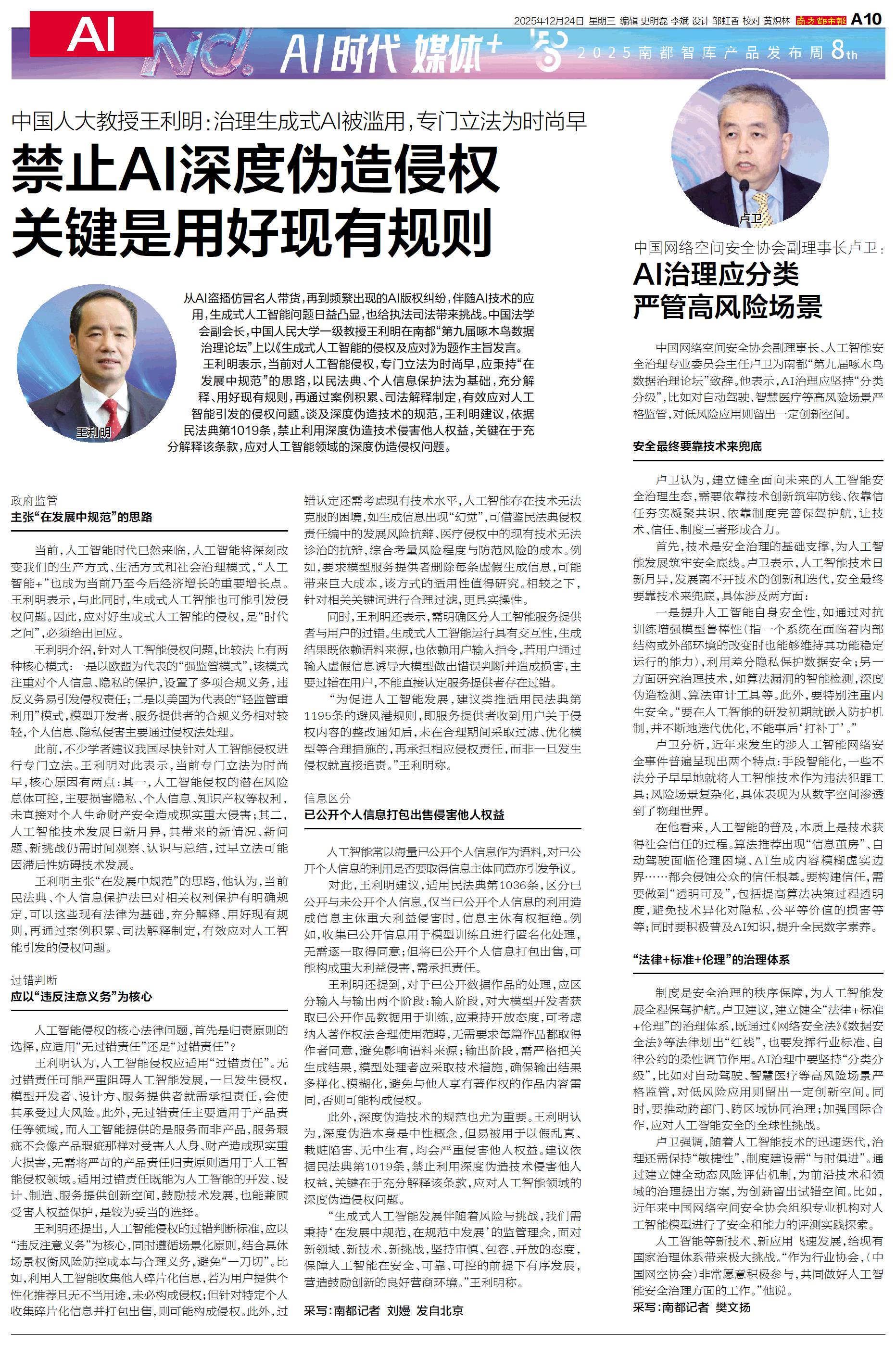 中国法学会副会长,中国人民大学一级教授王利明在南都“第九届啄木鸟数据治理论坛”上以《生成式人工智能的侵权及应对》为题作主旨发言。