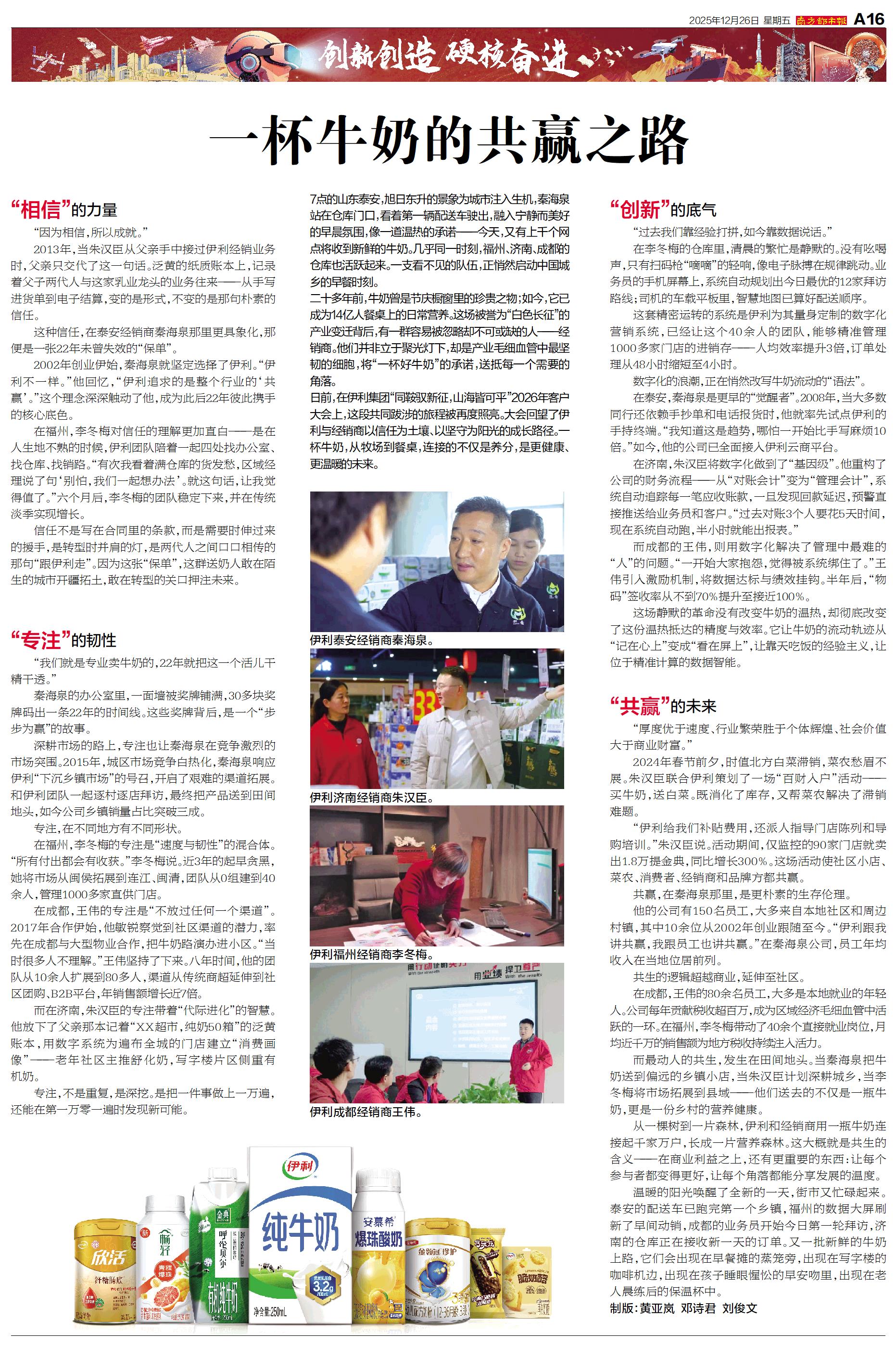 7点的山东泰安,旭日东升的景象为城市注入生机,秦海泉站在仓库门口,看着第一辆配送车驶出,融入宁静而美好的早晨氛围,像一道温热的承诺——今天,又有上千个网点将收到新鲜的牛奶。