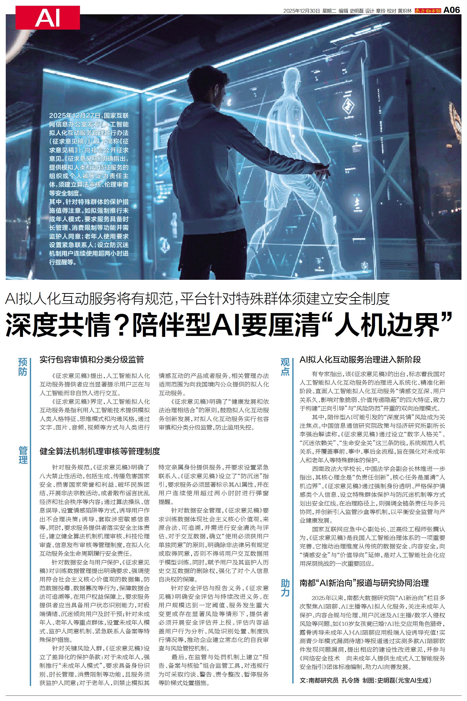 有专家指出,该《征求意见稿》的出台,标志着我国对人工智能拟人化互动服务的治理进入系统化、精准化新阶段。直面人工智能拟人化互动服务“情感交互深、用户关系久、影响对象脆弱、价值传递隐蔽”的四大特征,致力于构建“正向引导”与“风险防范”并重的双向治理模式。