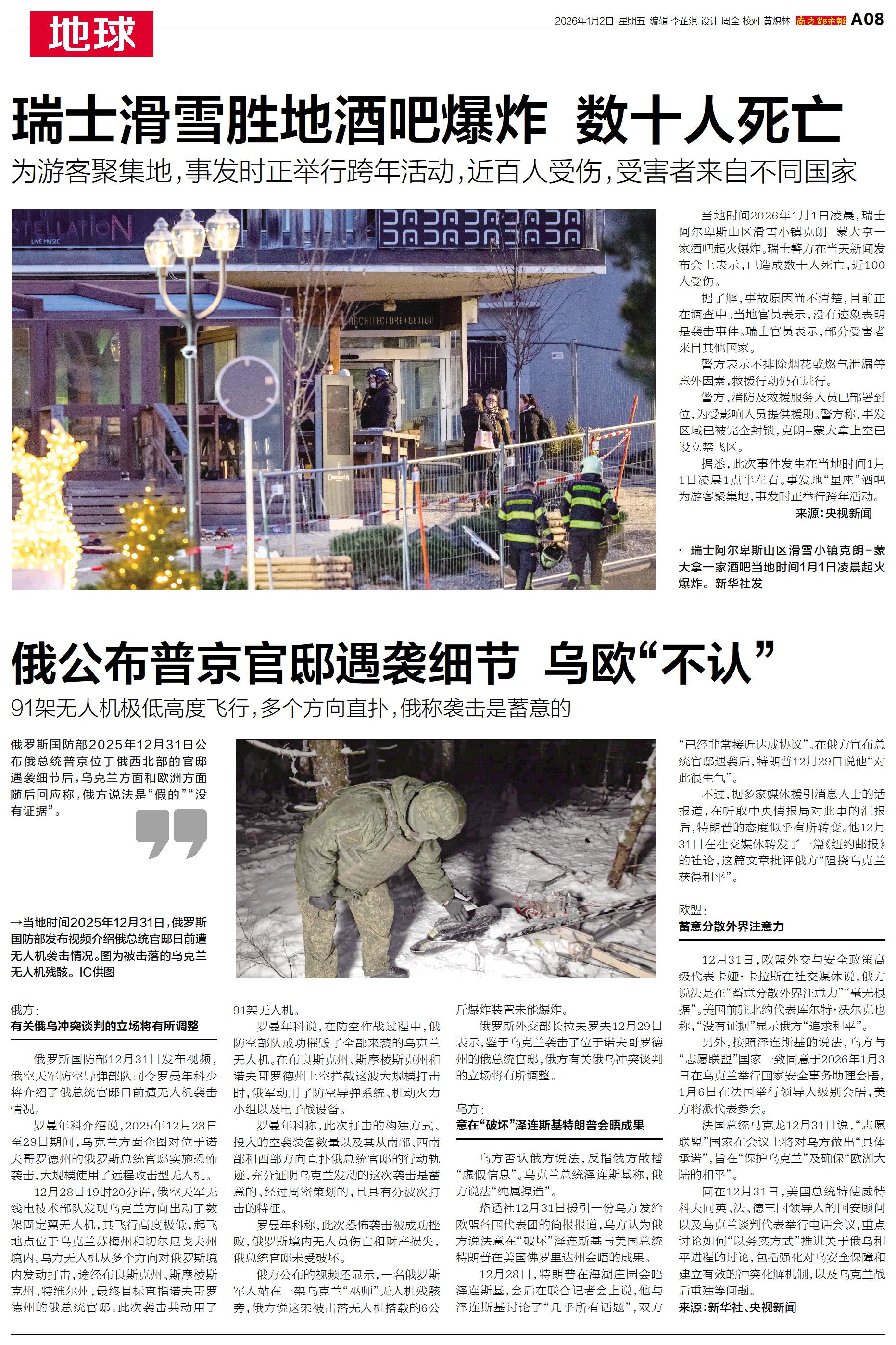 当地时间2026年1月1日凌晨,瑞士阿尔卑斯山区滑雪小镇克朗-蒙大拿一家酒吧起火爆炸。