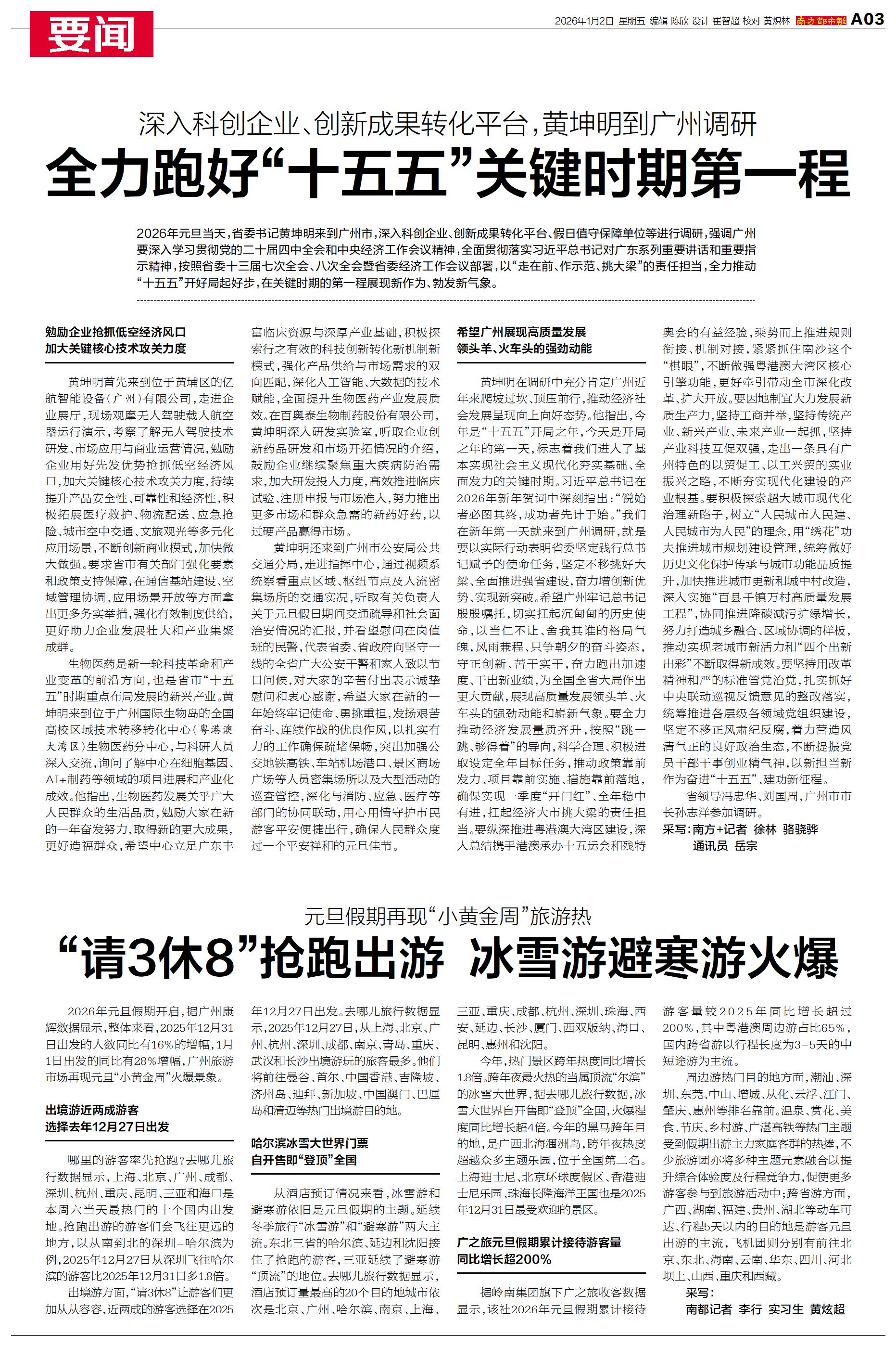 2026年元旦当天,省委书记黄坤明来到广州市,深入科创企业、创新成果转化平台、假日值守保障单位等进行调研。