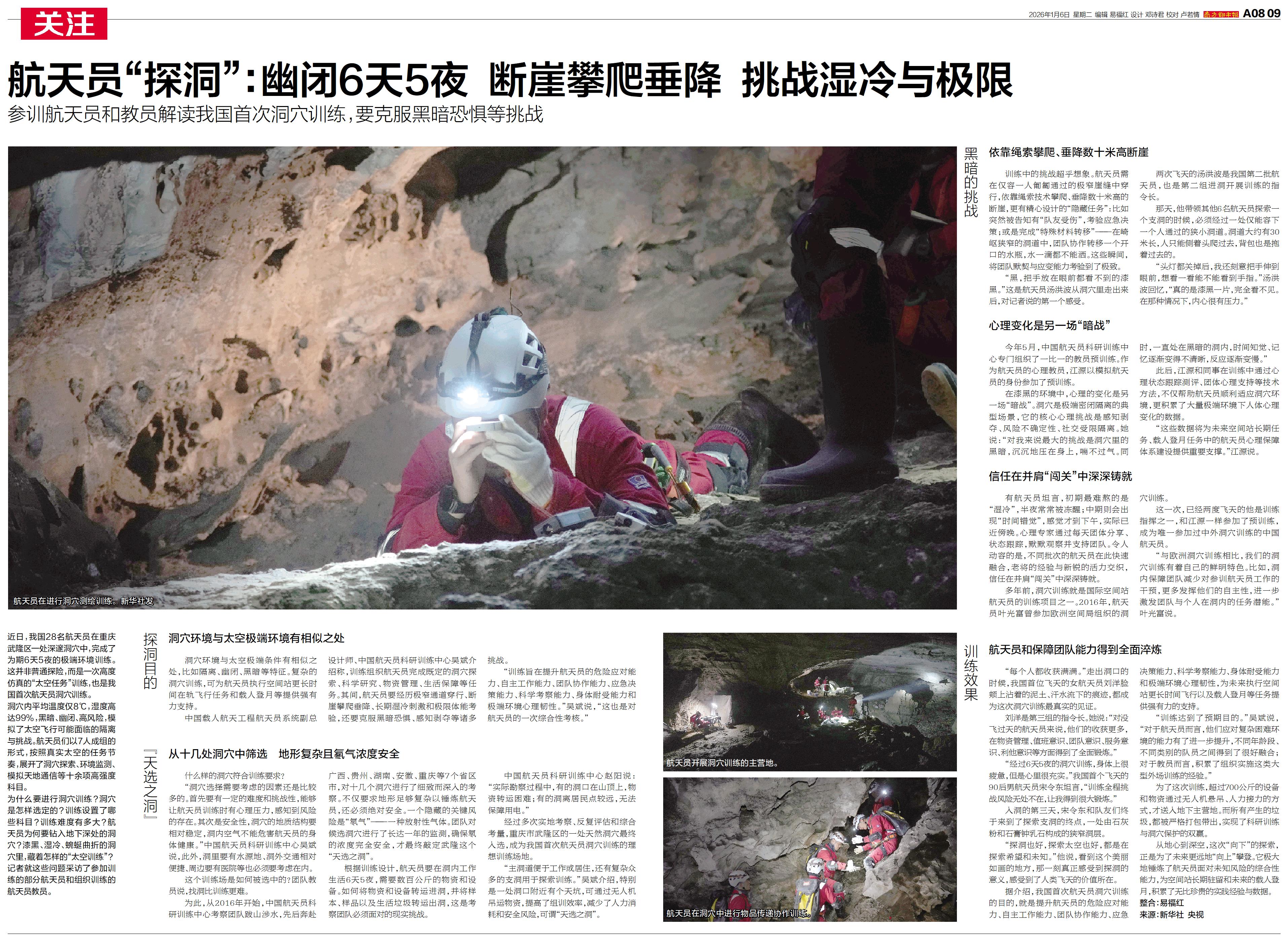 近日,我国28名航天员在重庆武隆区一处深邃洞穴中,完成了为期6天5夜的极端环境训练。