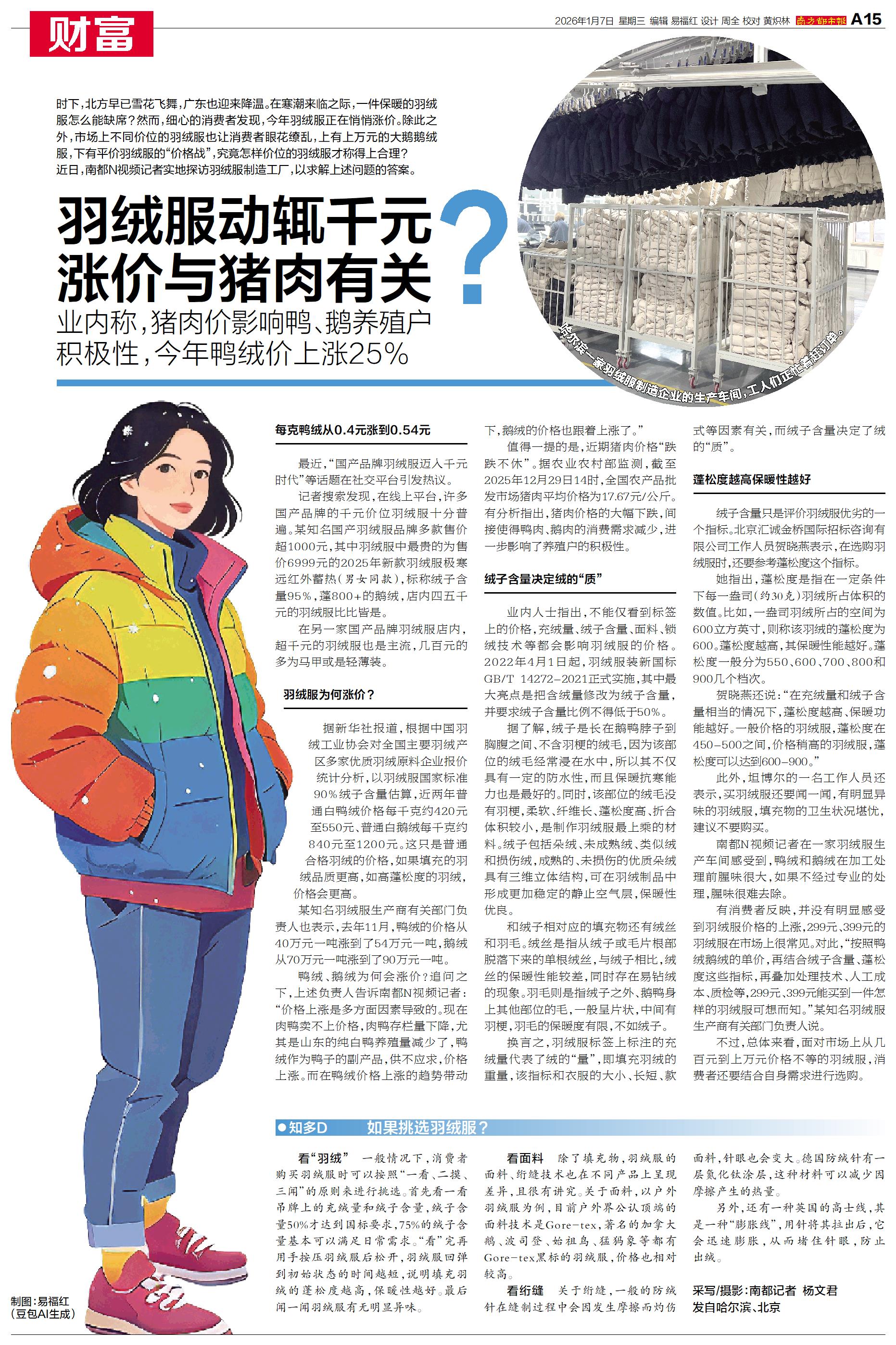 某知名羽绒服生产商有关部门负责人也表示,去年11月,鸭绒的价格从40万元一吨涨到了54万元一吨,鹅绒从70万元一吨涨到了90万元一吨。