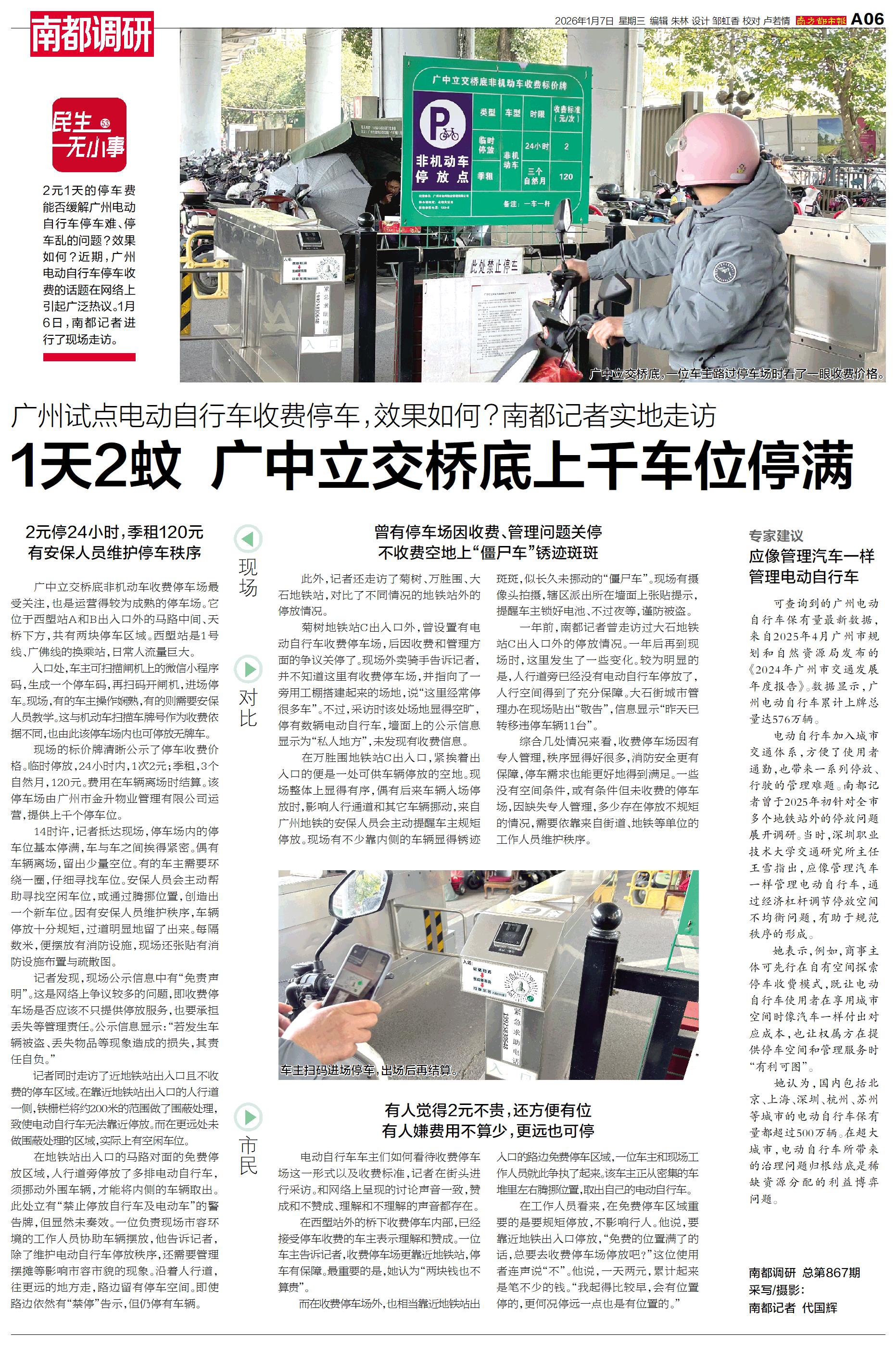 2元1天的停车费能否缓解广州电动自行车停车难、停车乱的问题?效果如何?近期,广州电动自行车停车收费的话题在网络上引起广泛热议。1月6日,南都记者进行了现场走访。