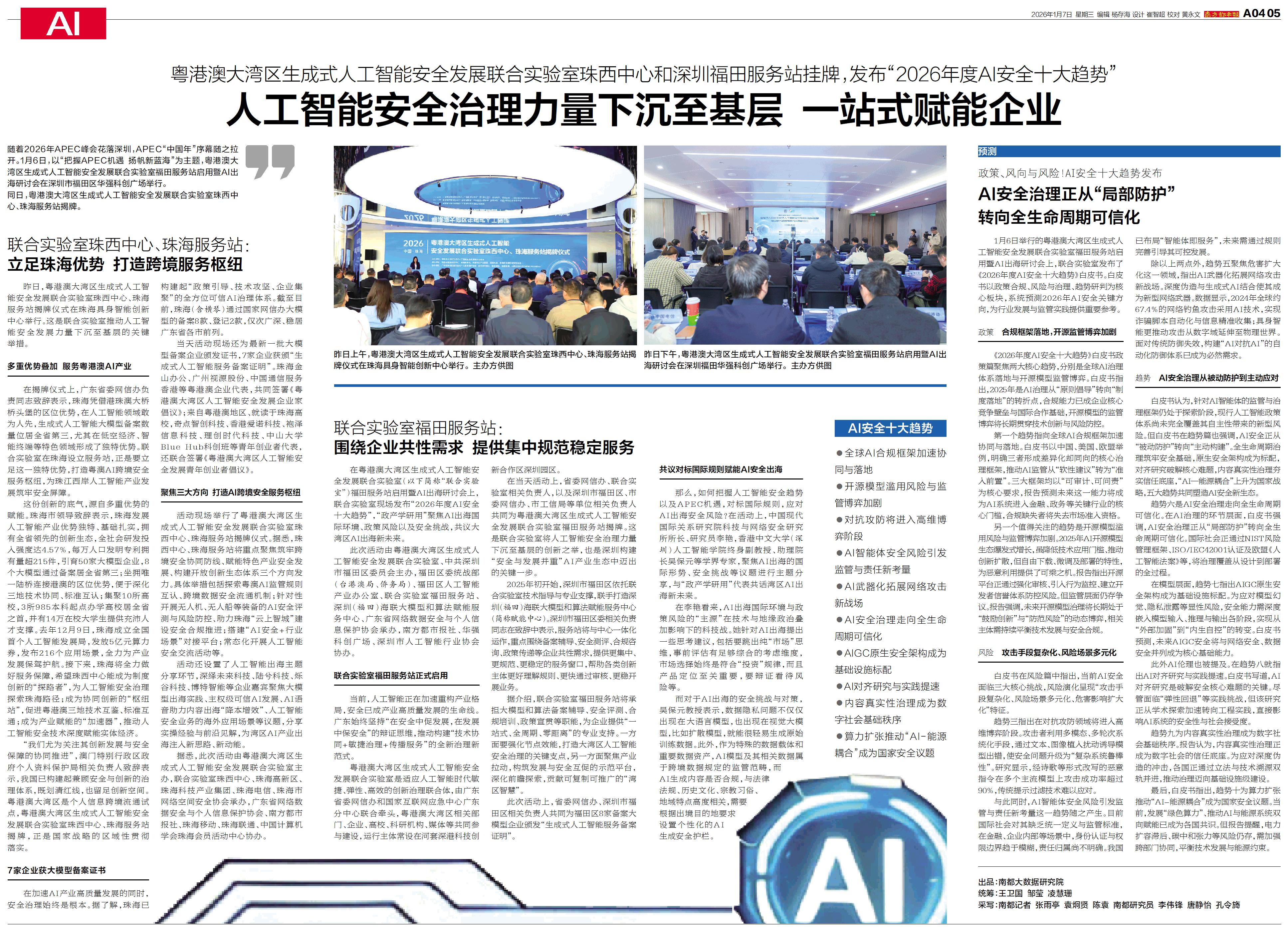 1月6日,以“把握APEC机遇 扬帆新蓝海”为主题,粤港澳大湾区生成式人工智能安全发展联合实验室福田服务站启用暨AI出海研讨会在深圳市福田区华强科创广场举行。