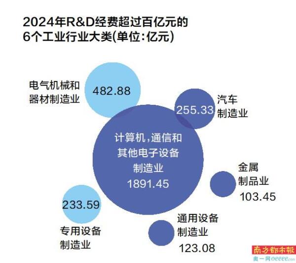 产业投向方面,重点领域集中度显著提升。全省有6个工业行业大类的R&D经费超过百亿元,分别为计算机、通信和其他电子设备制造业,电气机械和器材制造业,汽车制造业,专用设备制造业,通用设备制造业,金属制品业,比上年增加1个。其中,计算机、通信和其他电子设备制造业的R&D经费投入最多,高达1891.45亿元。这6个行业R&D经费合计3089.79亿元,占规模以上工业企业R&D经费的比重达到83.4%,比重比2023年显著提高5.4个百分点,为产业升级注入了强劲动能。