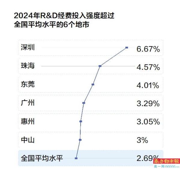 此外,投入强度超过全国平均水平(2.69%)的地市则有6个,分别是深圳、珠海、东莞、广州、惠州、中山。其中,深圳研发强度6.67%,居全国副省级以上城市首位;珠海则以19.1%的增速表现突出,成为区域科创增长的重要亮点。