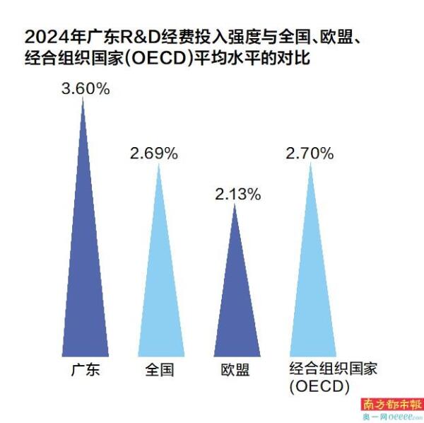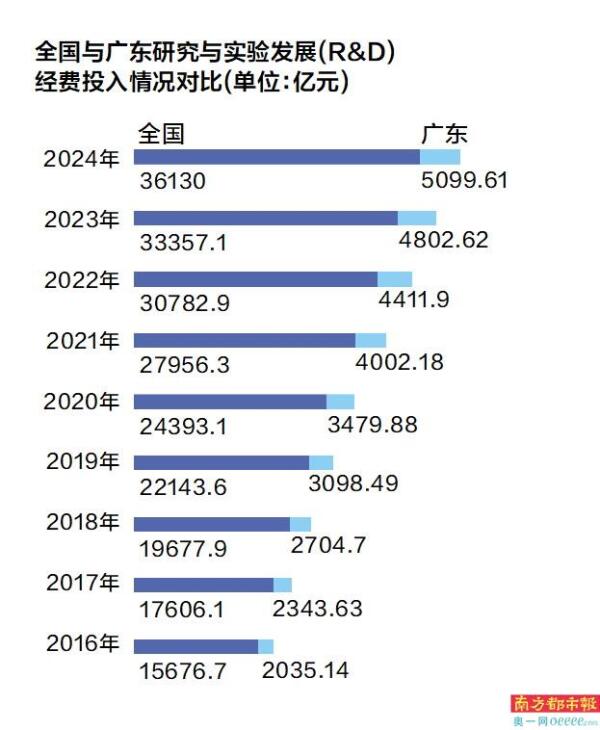 最新发布的《2024年广东省科技经费投入统计公报》(以下简称《公报》)显示,广东研究与试验发展(R&D)经费已连续9年位居全国首位,投入强度(与GDP之比)高于全国平均水平,也超过欧盟及经合组织国家(OECD)平均水平,凸显出其在科技创新上的领先优势。