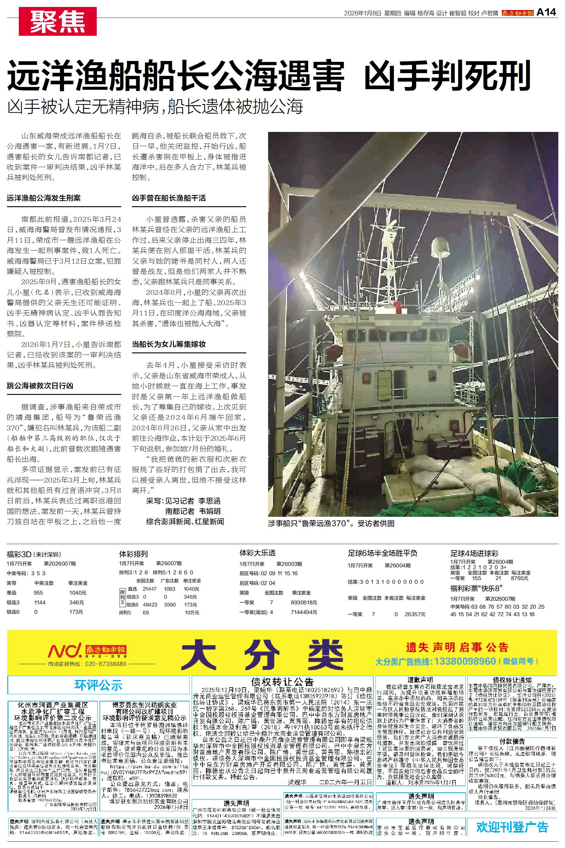 山东威海荣成远洋渔船船长在公海遇害一案,有新进展。1月7日,遇害船长的女儿告诉南都记者,已收到案件一审判决结果,凶手林某兵被判处死刑。