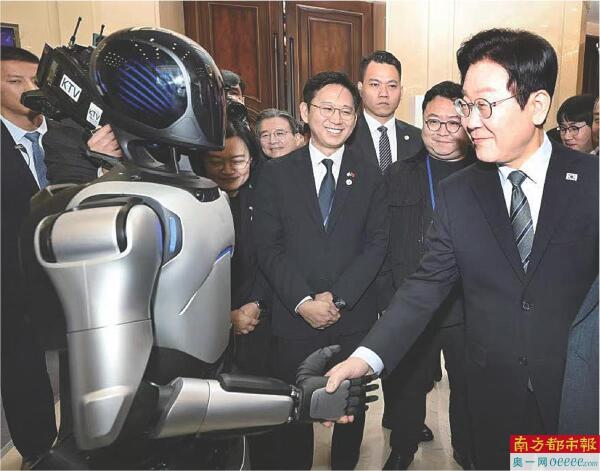 1月7日,中韩创新创业论坛在上海举行,韩国总统李在明与论坛企业展展区上的中国机器人握手。 新华社发