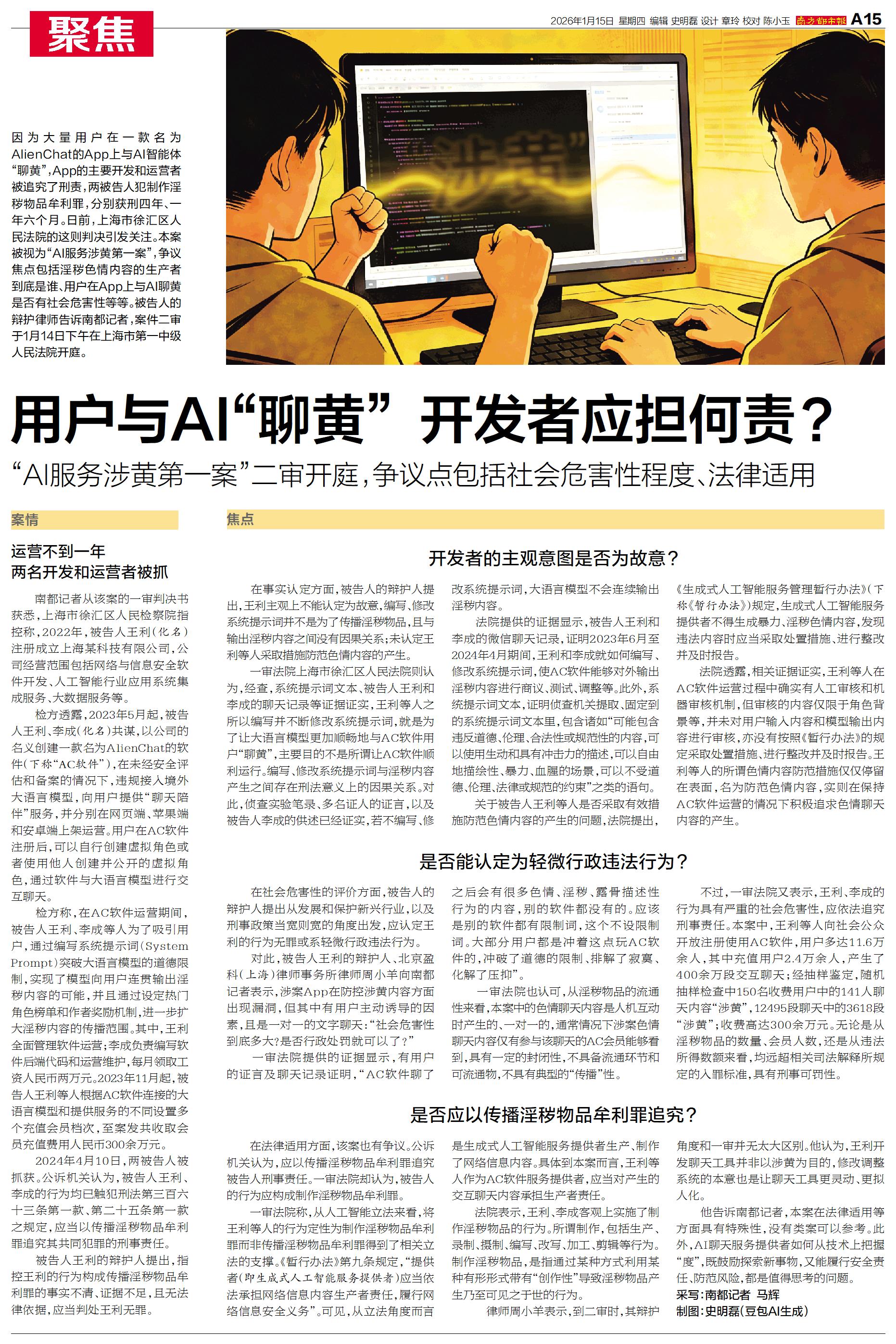 因为大量用户在一款名为AlienChat的App上与AI智能体“聊黄”,App的主要开发和运营者被追究了刑责,两被告人犯制作淫秽物品牟利罪,分别获刑四年、一年六个月。日前,上海市徐汇区人民法院的这则判决引发关注。本案被视为“AI服务涉黄第一案”,争议焦点包括淫秽色情内容的生产者到底是谁、用户在App上与AI聊黄是否有社会危害性等等。被告人的辩护律师告诉南都记者,案件二审于1月14日下午在上海市第一中级人民法院开庭。
