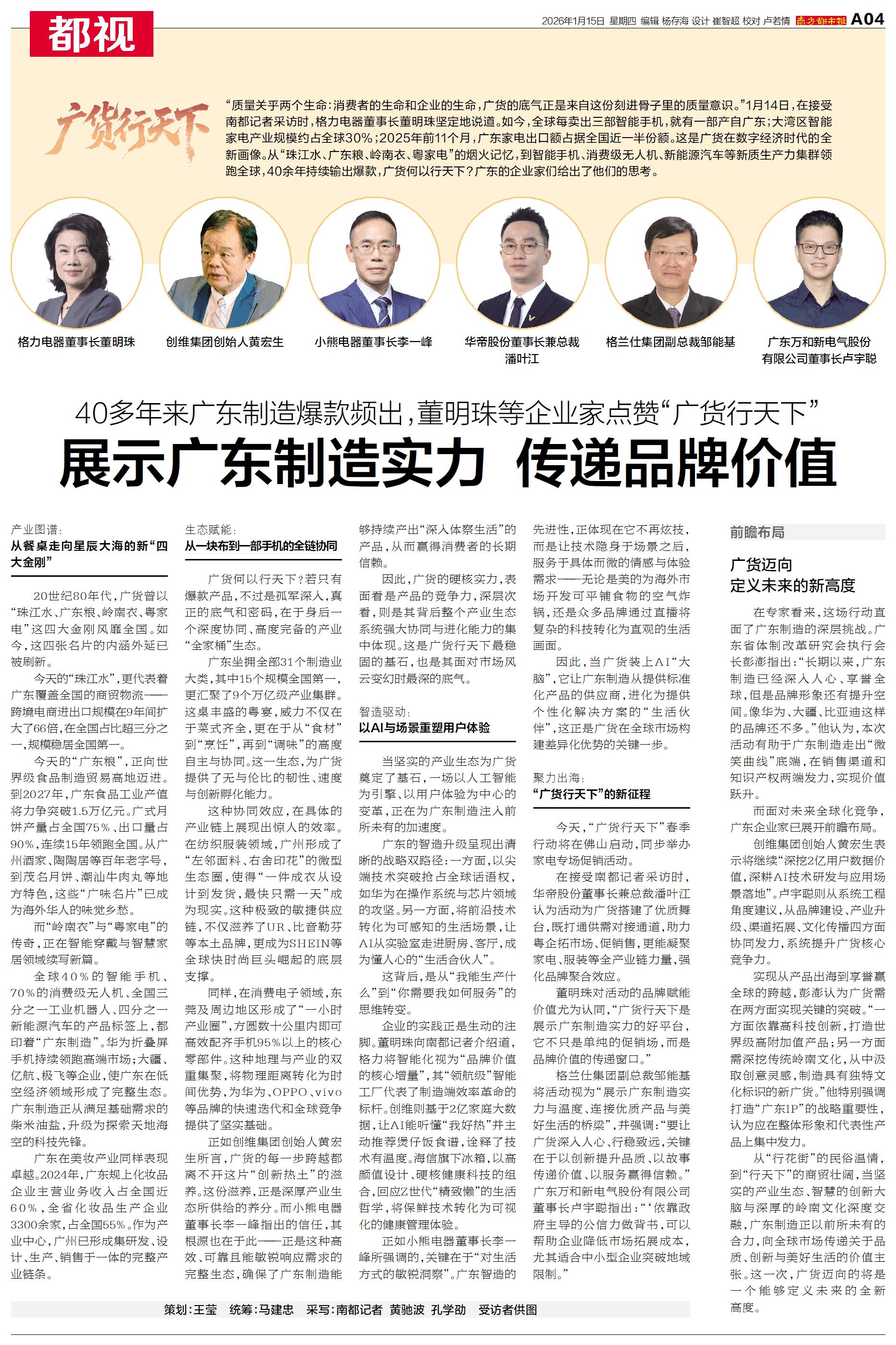 从“珠江水、广东粮、岭南衣、粤家电”的烟火记忆,到智能手机、消费级无人机、新能源汽车等新质生产力集群领跑全球,40余年持续输出爆款,广货何以行天下?广东的企业家们给出了他们的思考。