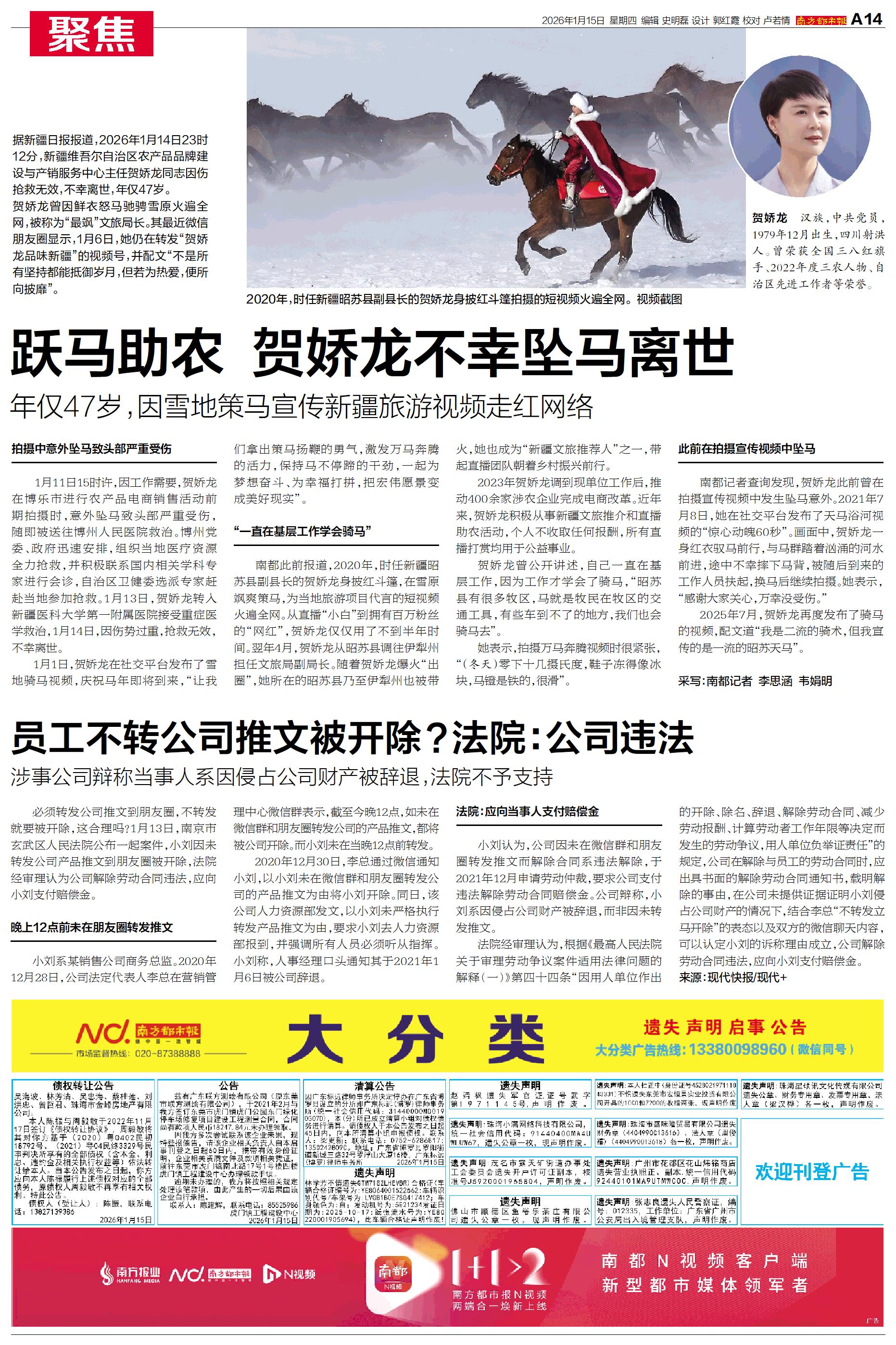 2026年1月14日23时12分,新疆维吾尔自治区农产品品牌建设与产销服务中心主任贺娇龙同志因伤抢救无效,不幸离世,年仅47岁。