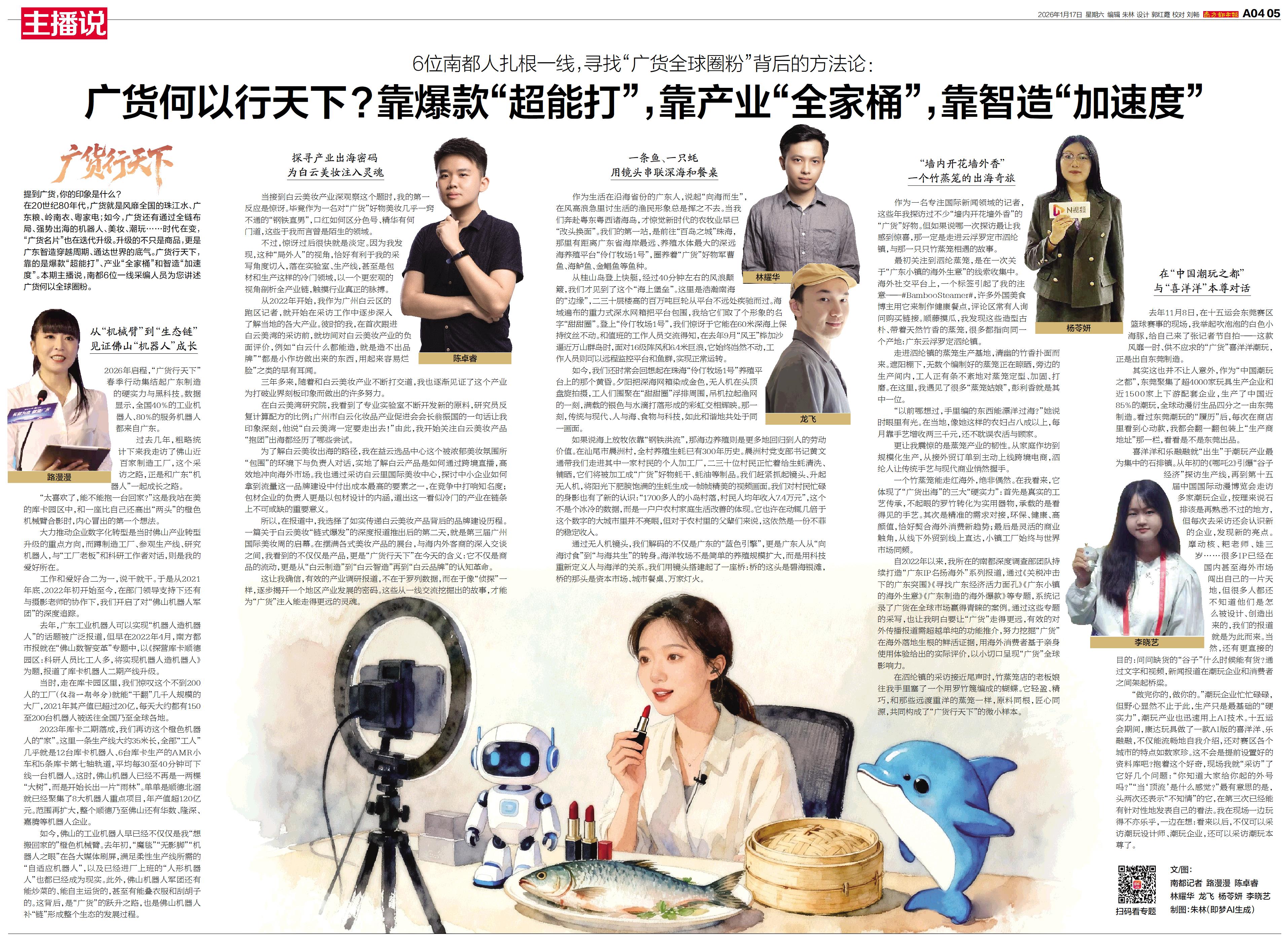 在20世纪80年代,广货就是风靡全国的珠江水、广东粮、岭南衣、粤家电;如今,广货还有通过全链布局、强势出海的机器人、美妆、潮玩……时代在变,“广货名片”也在迭代升级。升级的不只是商品,更是广东智造穿越周期、通达世界的底气。广货行天下,靠的是爆款“超能打”、产业“全家桶”和智造“加速度”。本期主播说,南都6位一线采编人员为您讲述广货何以全球圈粉。