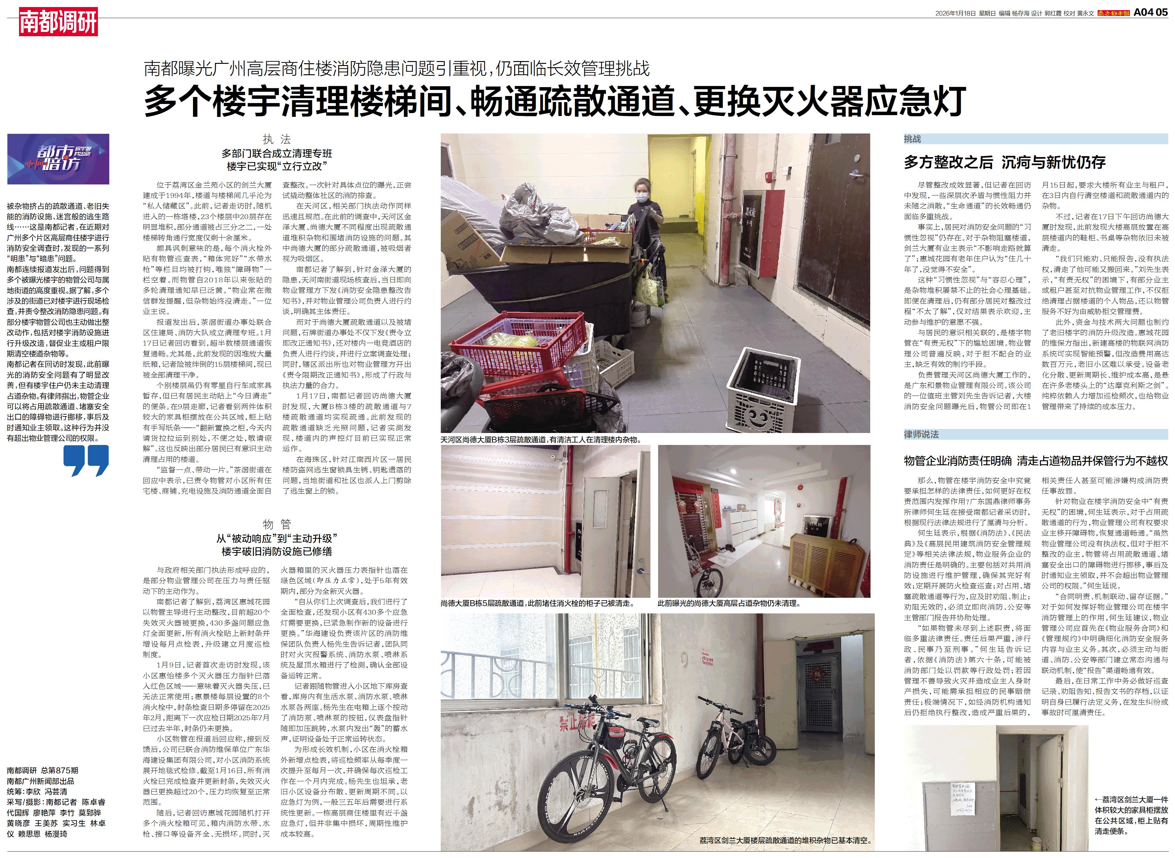 南都记者在回访时发现,此前曝光的消防安全问题有了明显改善,但有楼宇住户仍未主动清理占道杂物。有律师指出,物管企业可以将占用疏散通道、堵塞安全出口的障碍物进行挪移,事后及时通知业主领取。这种行为并没有超出物业管理公司的权限。