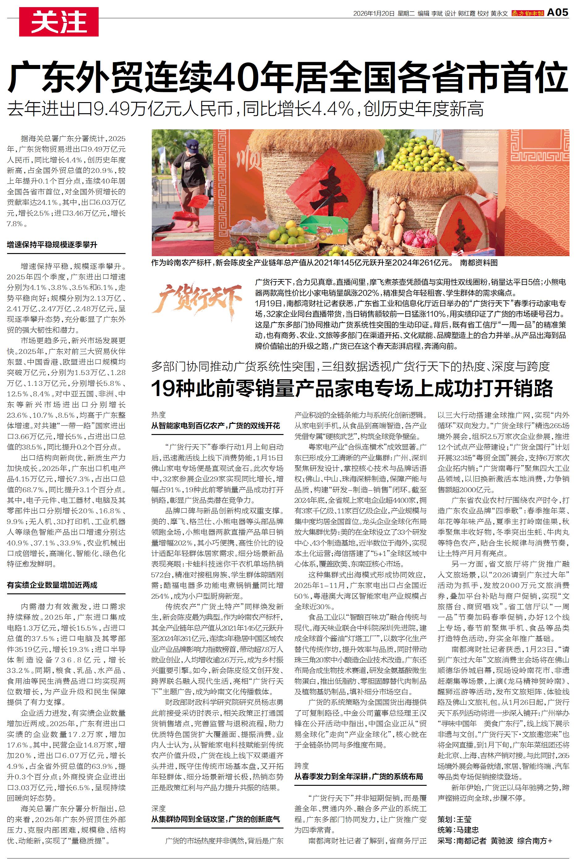 南都湾财社记者获悉,广东省工业和信息化厅近日举办的“广货行天下”春季行动家电专场,32家企业同台直播带货,当日销售额较前一日猛涨110%,用实绩印证了广货的市场硬号召力。
