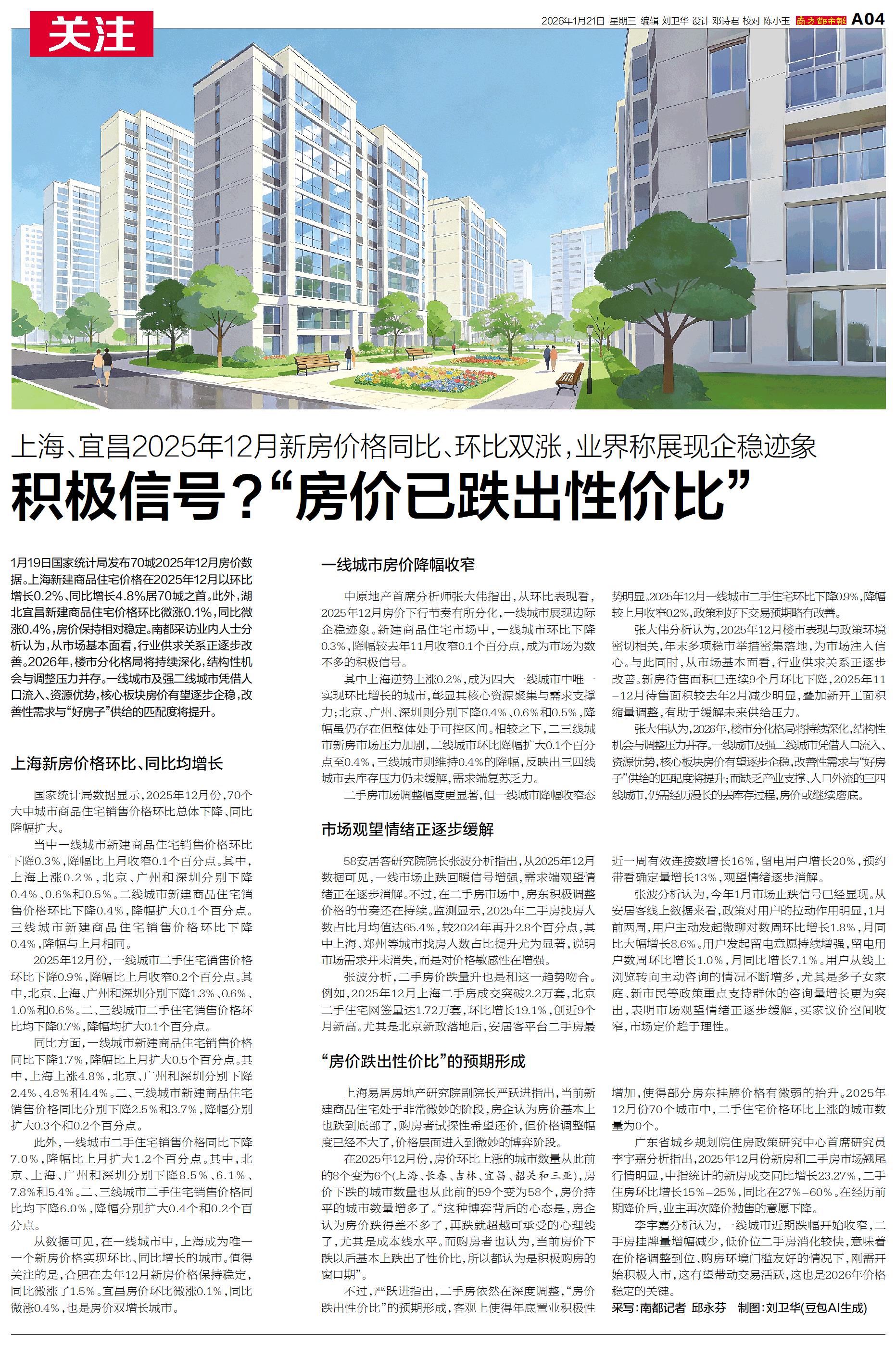 1月19日国家统计局发布70城2025年12月房价数据。上海新建商品住宅价格在2025年12月以环比增长0.2%、同比增长4.8%居70城之首。