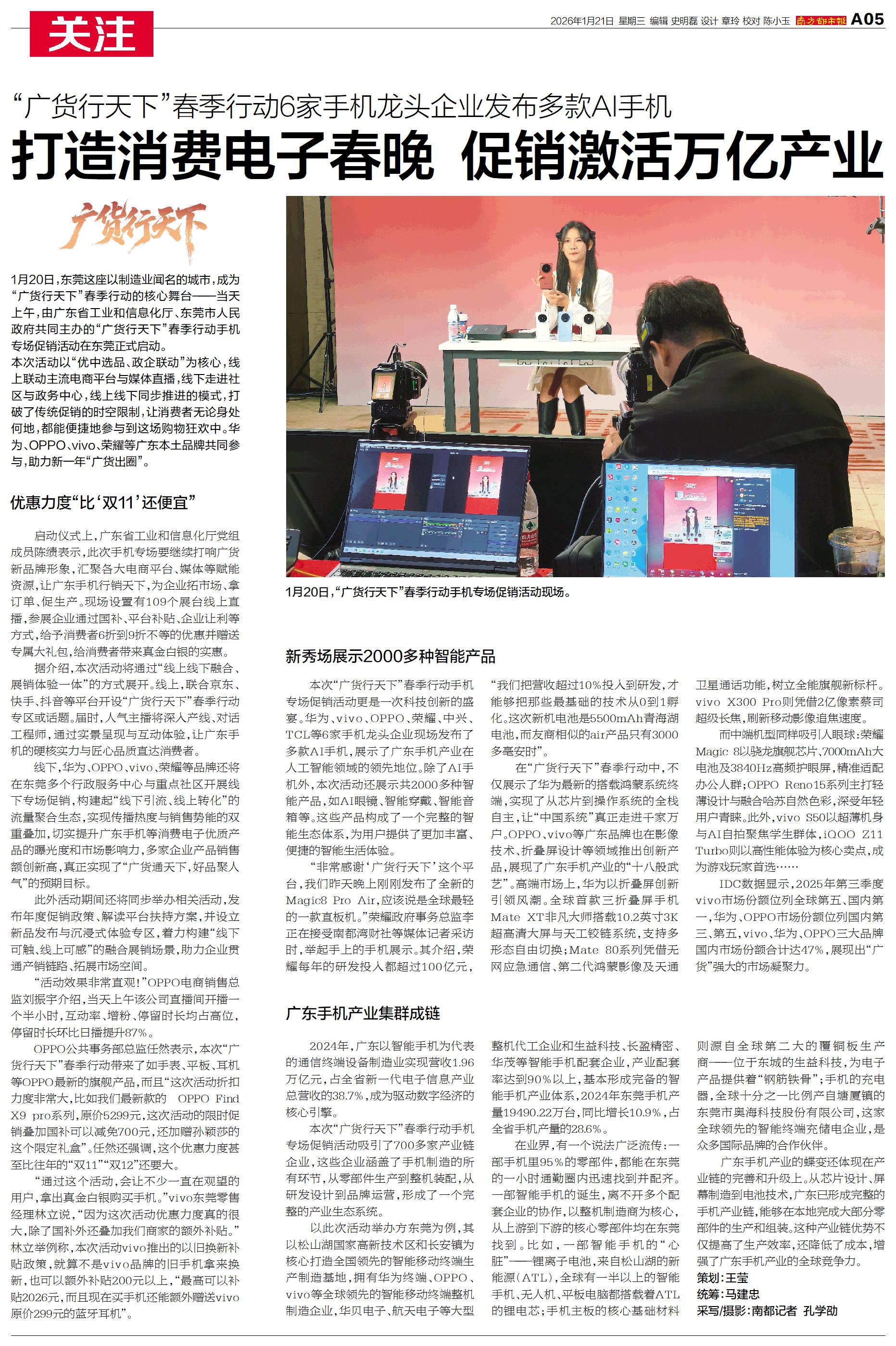 1月20日,东莞这座以制造业闻名的城市,成为“广货行天下”春季行动的核心舞台——当天上午,由广东省工业和信息化厅、东莞市人民政府共同主办的“广货行天下”春季行动手机专场促销活动在东莞正式启动。