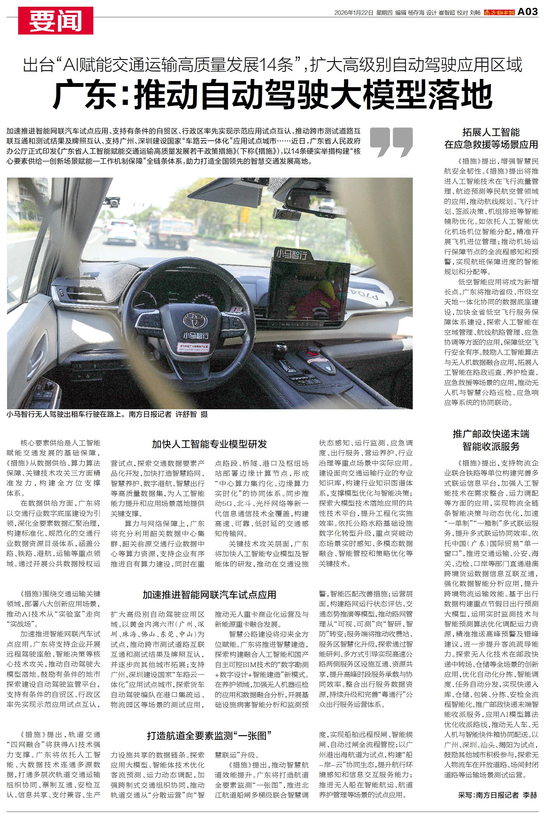 近日,广东省人民政府办公厅正式印发《广东省人工智能赋能交通运输高质量发展若干政策措施》,以14条硬实举措构建“核心要素供给—创新场景赋能—工作机制保障”全链条体系,助力打造全国领先的智慧交通发展高地。