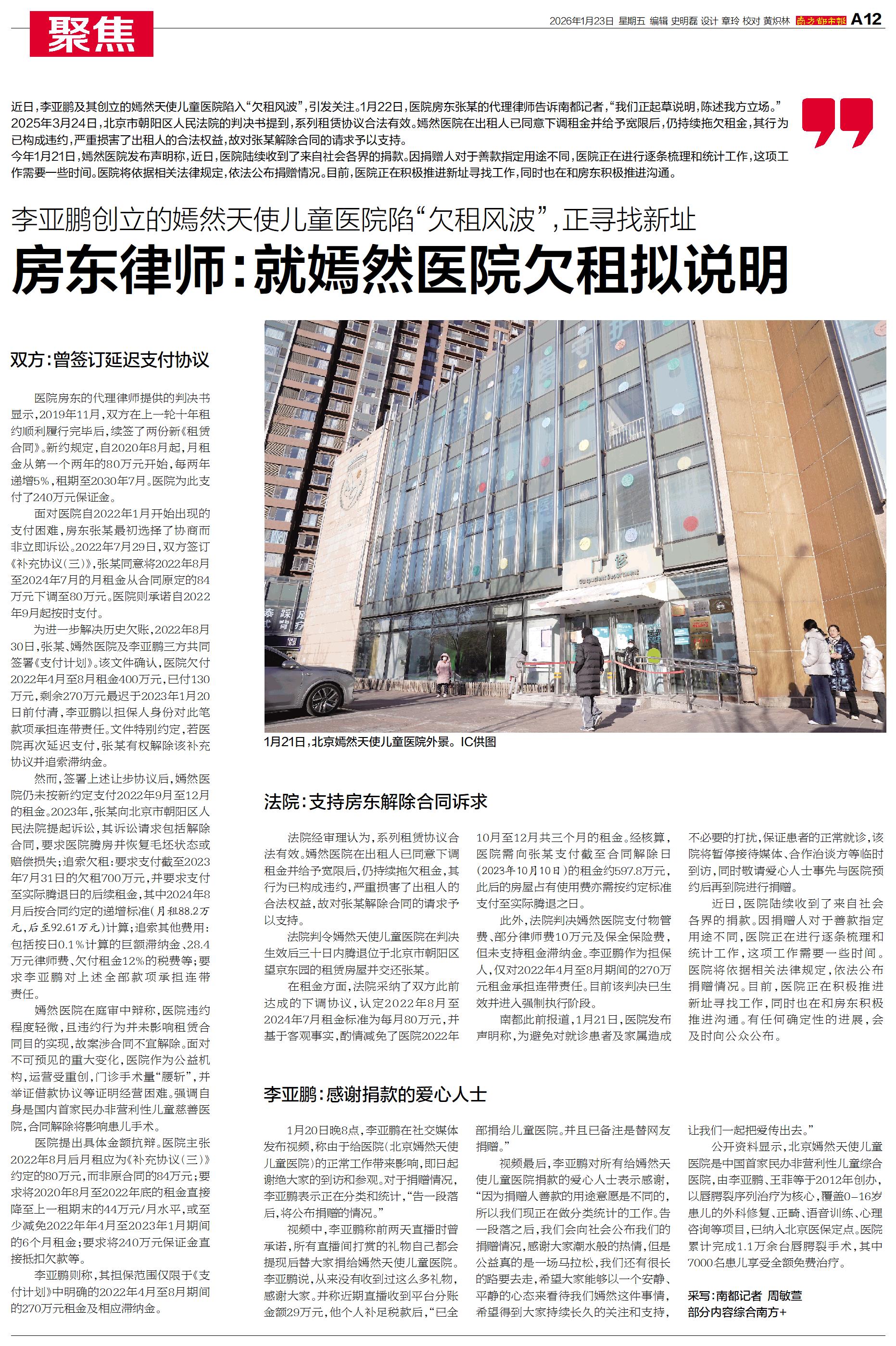 近日,李亚鹏及其创立的嫣然天使儿童医院陷入“欠租风波”,引发关注。1月22日,医院房东张某的代理律师告诉南都记者,“我们正起草说明,陈述我方立场。”