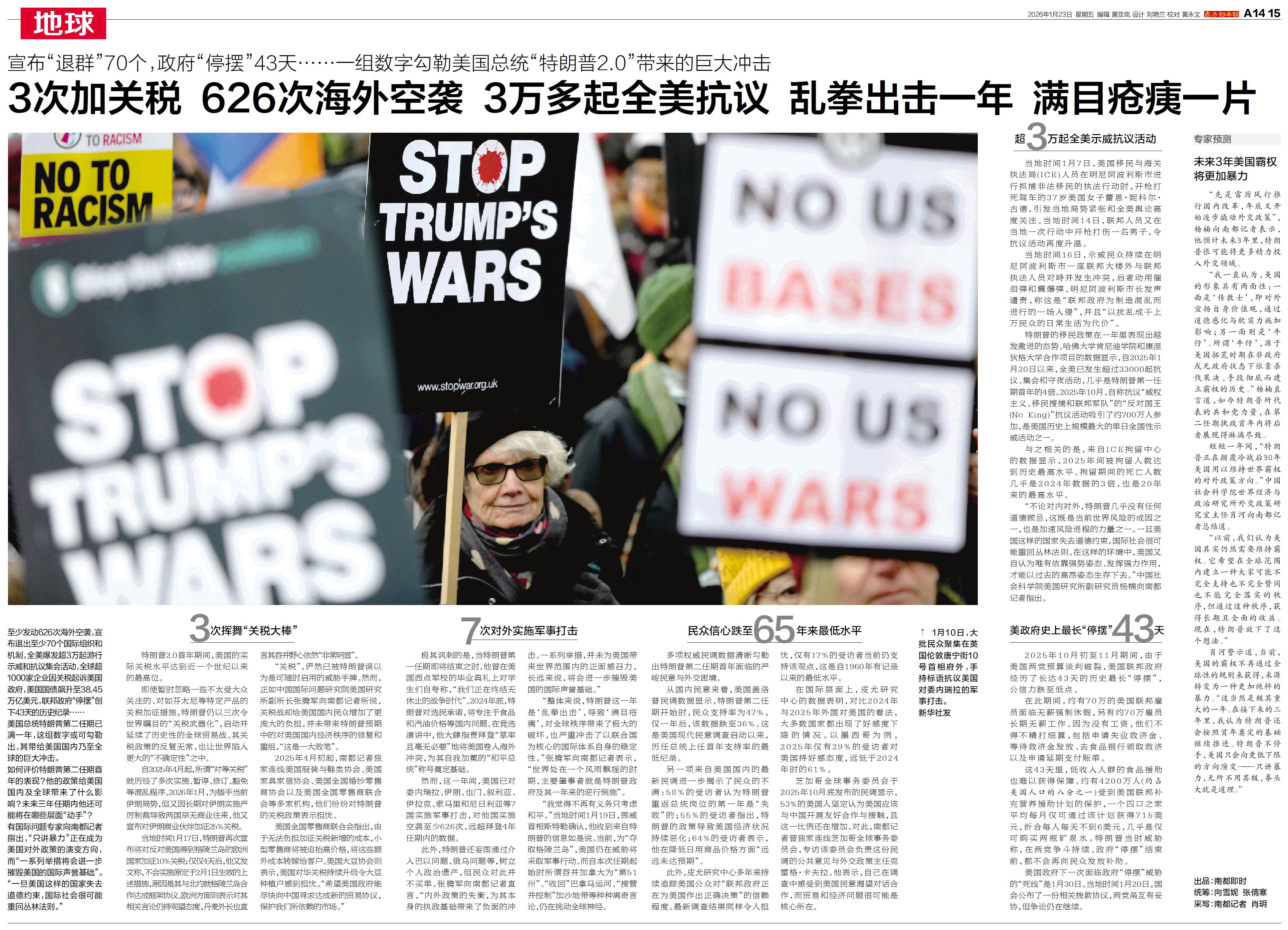 3次加关税 626次海外空袭 3万多起全美抗议 乱拳出击一年 满目疮痍一片