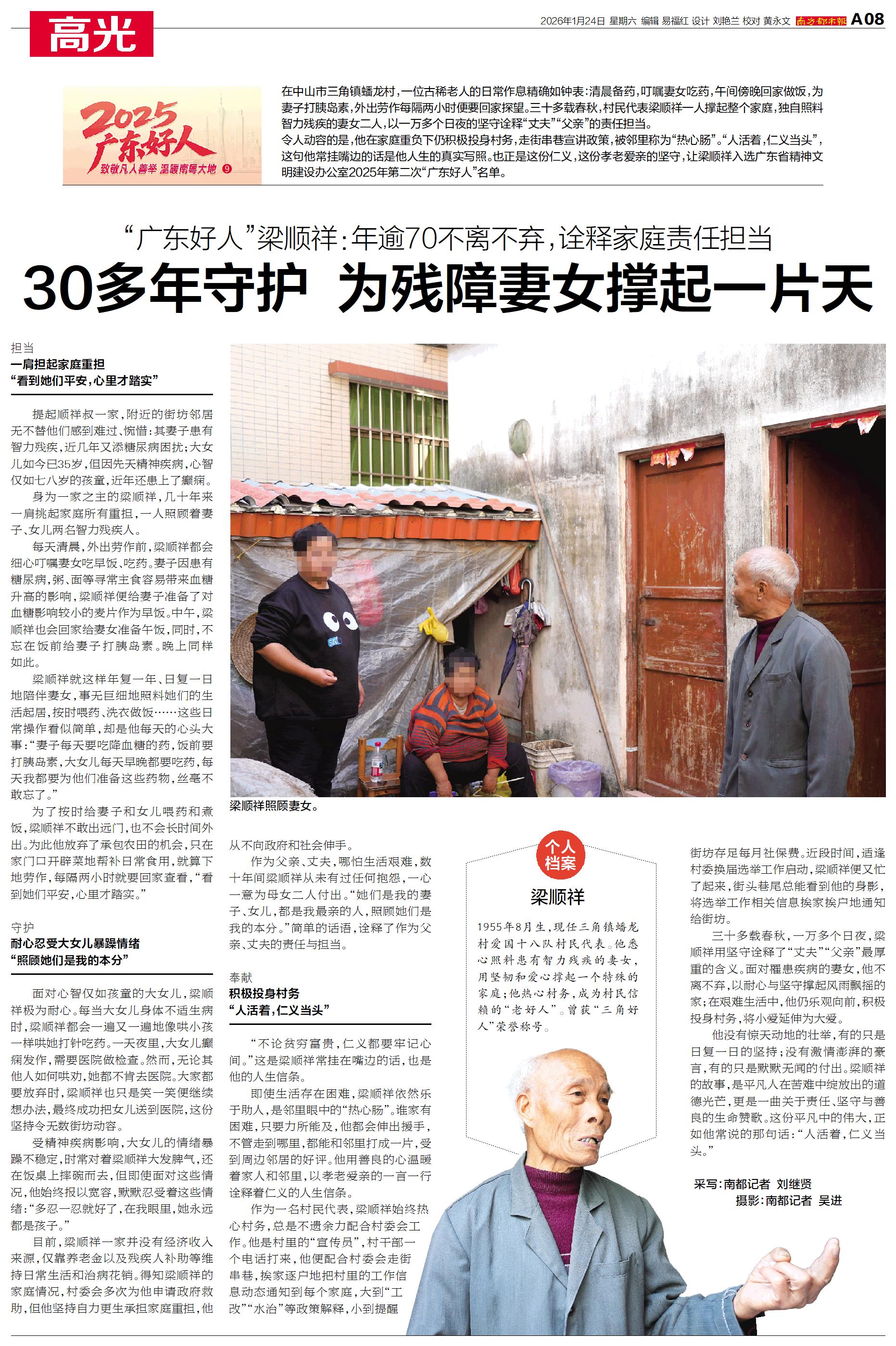 他悉心照料患有智力残疾的妻女,用坚韧和爱心撑起一个特殊的家庭;他热心村务,成为村民信赖的“老好人”。曾获“三角好人”荣誉称号。