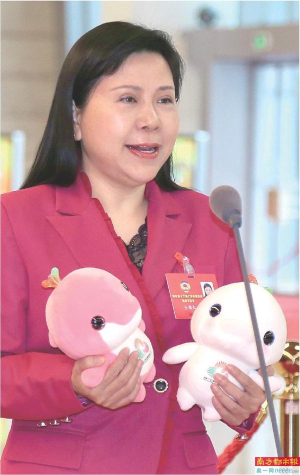 广东省政协委员、广东省出版印刷物资有限公司董事、总经理王维红手持十五运会和残特奥会吉祥物“喜洋洋”“乐融融”,来到了政协第十三届广东省委员会第四次会议第一场“委员通道”上。