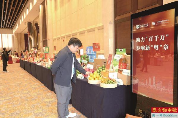会场内设置的“助力‘百千万’,奏响新‘粤’章”主题展区,陈列着来自广东各地产品,吸引了不少代表驻足欣赏。