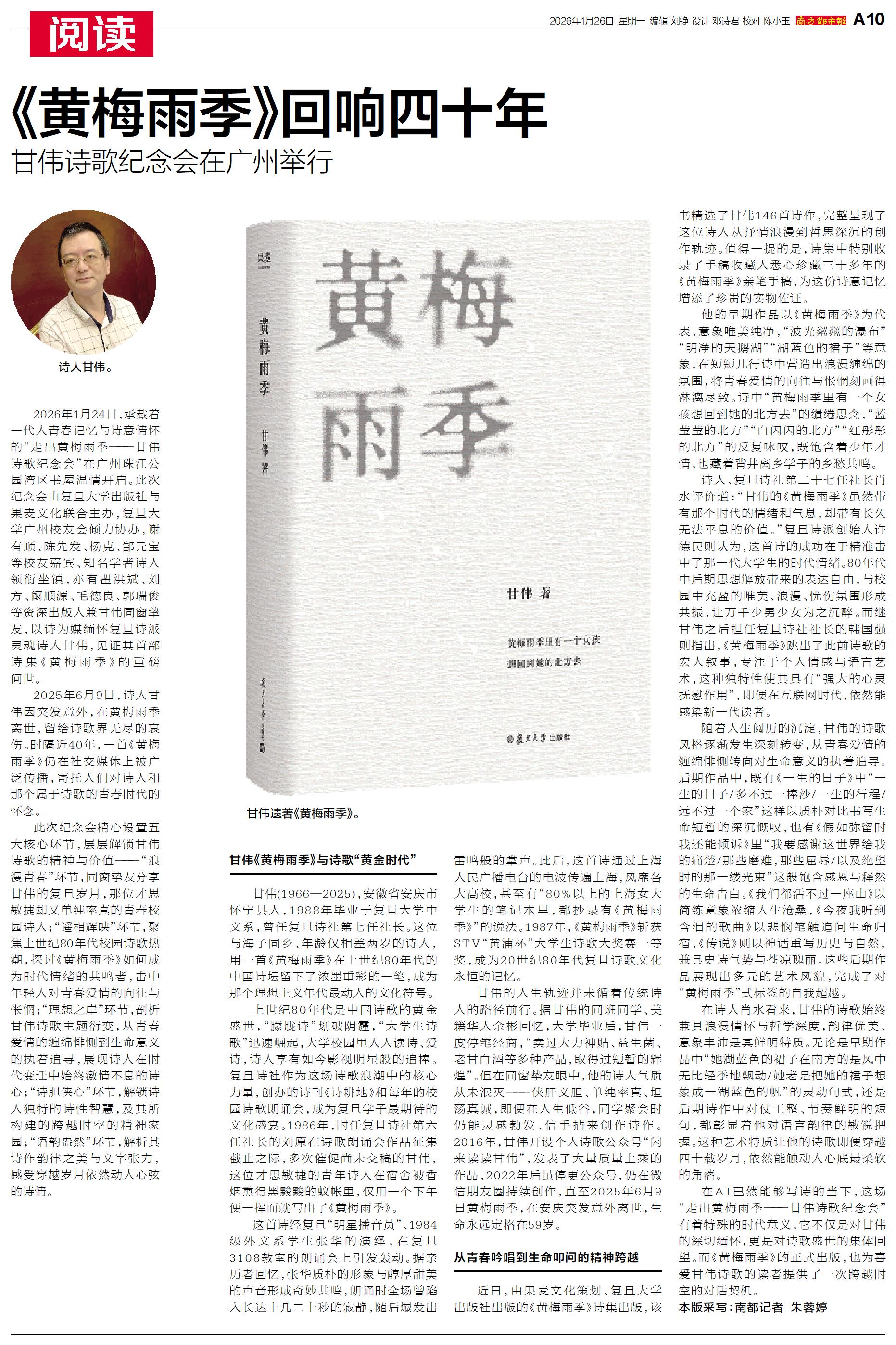 2026年1月24日,承载着一代人青春记忆与诗意情怀的“走出黄梅雨季——甘伟诗歌纪念会”在广州珠江公园湾区书屋温情开启。