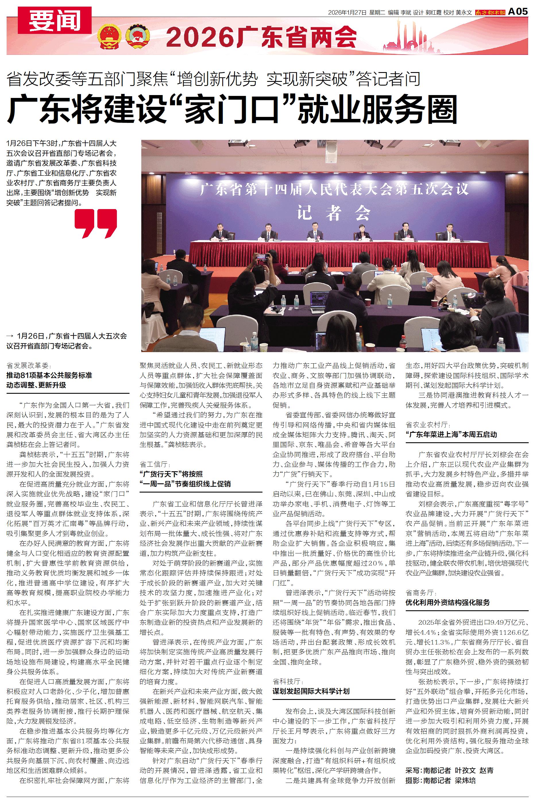 1月26日下午3时,广东省十四届人大五次会议召开省直部门专场记者会,邀请广东省发展改革委、广东省科技厅、广东省工业和信息化厅、广东省农业农村厅、广东省商务厅主要负责人出席。