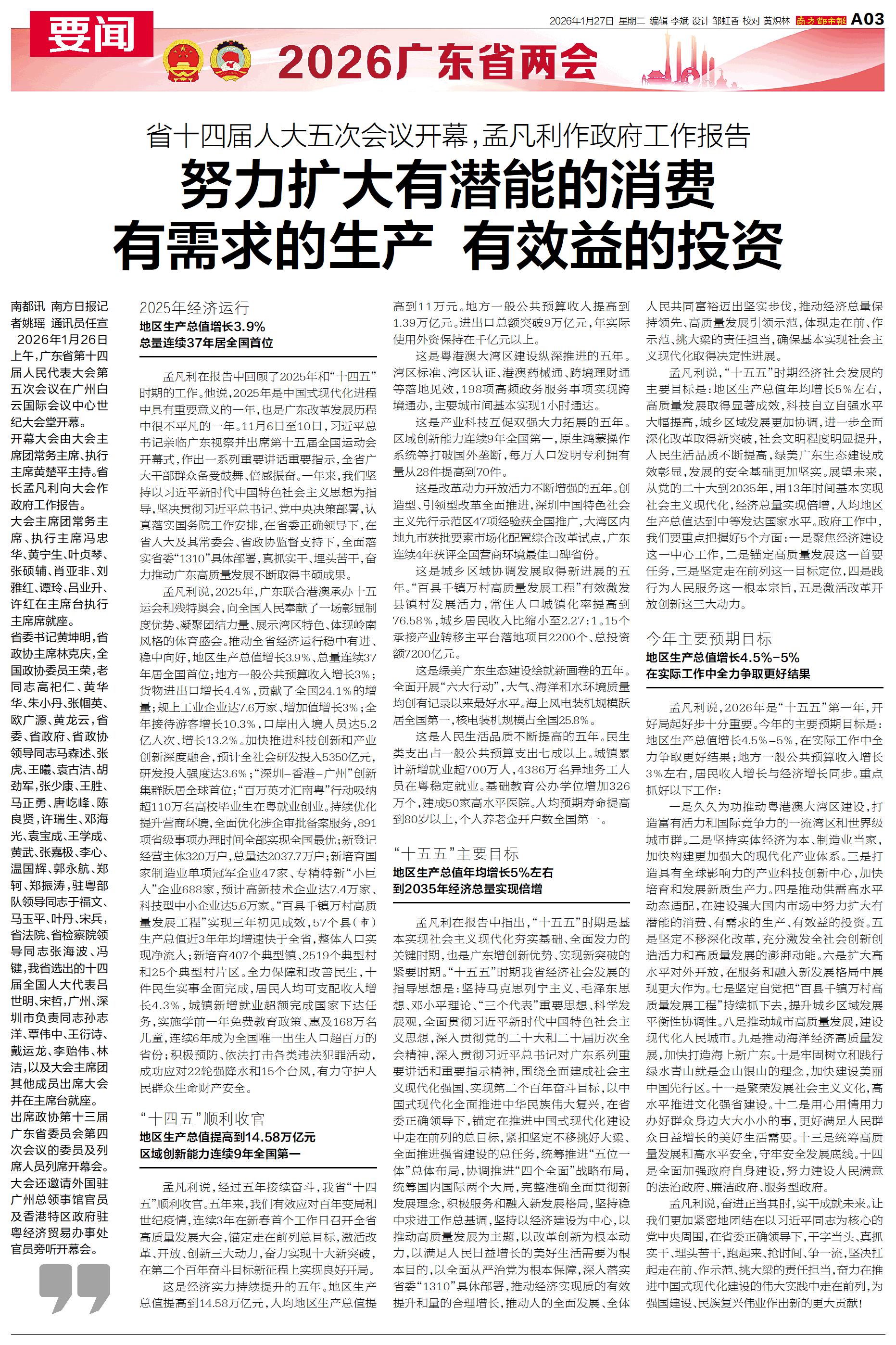 2026年1月26日上午,广东省第十四届人民代表大会第五次会议在广州白云国际会议中心世纪大会堂开幕。