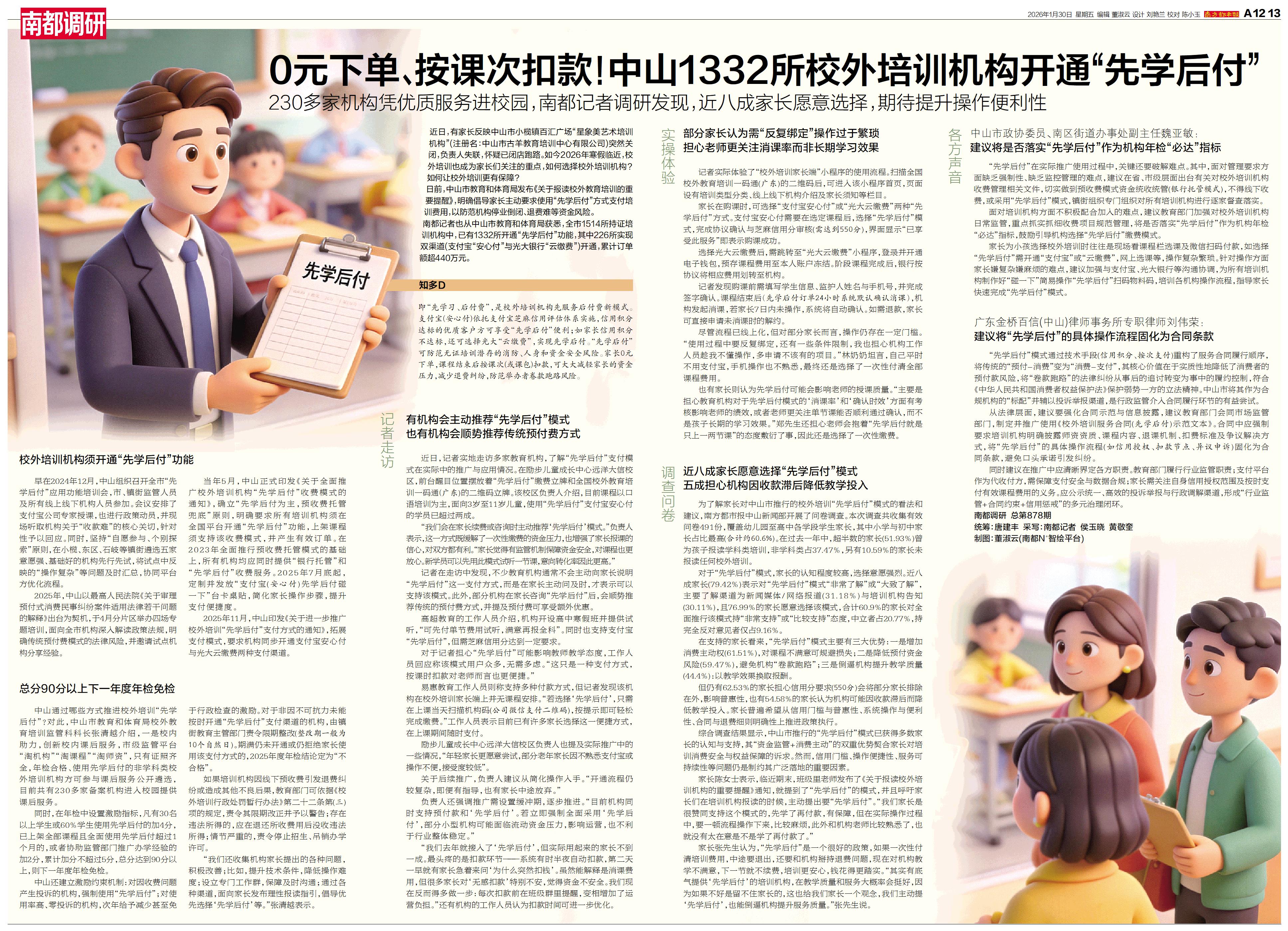 南都记者也从中山市教育和体育局获悉,全市1514所持证培训机构中,已有1332所开通“先学后付”功能,其中226所实现双渠道(支付宝“安心付”与光大银行“云缴费”)开通,累计订单额超440万元。