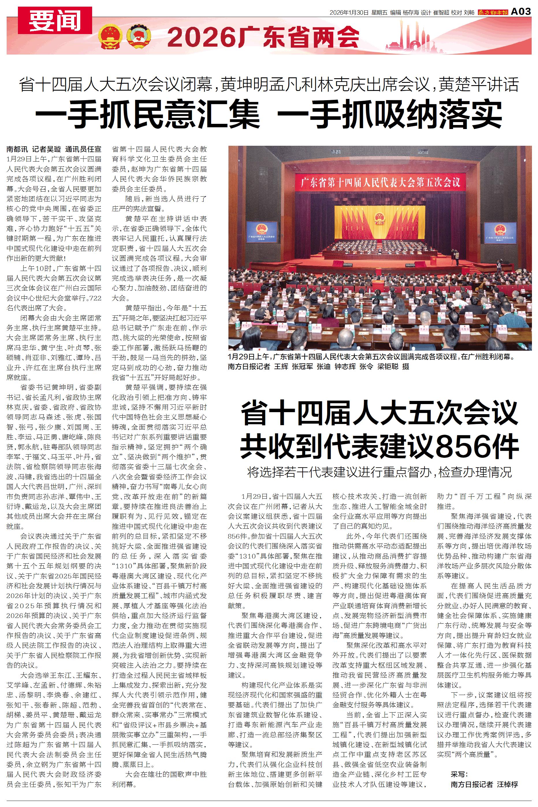 1月29日,省十四届人大五次会议在广州闭幕,记者从大会议案建议组获悉,省十四届人大五次会议共收到代表建议856件。